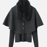 The ensemble consists of a fluffy fur-trimmed cape knit and a fitted top.