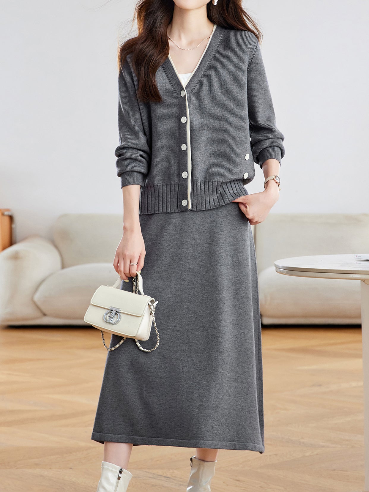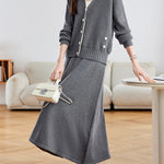 A set consisting of a cardigan and skirt that can be worn separately.