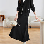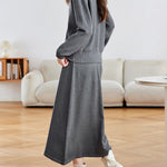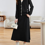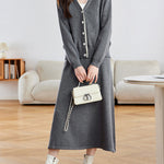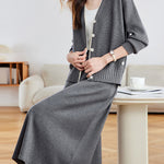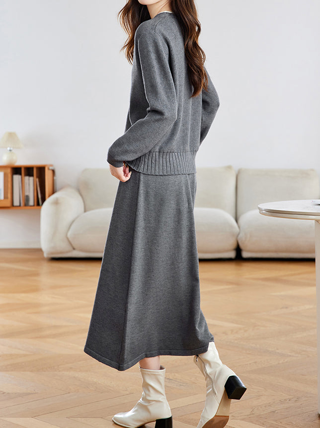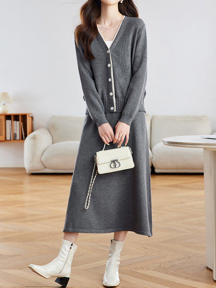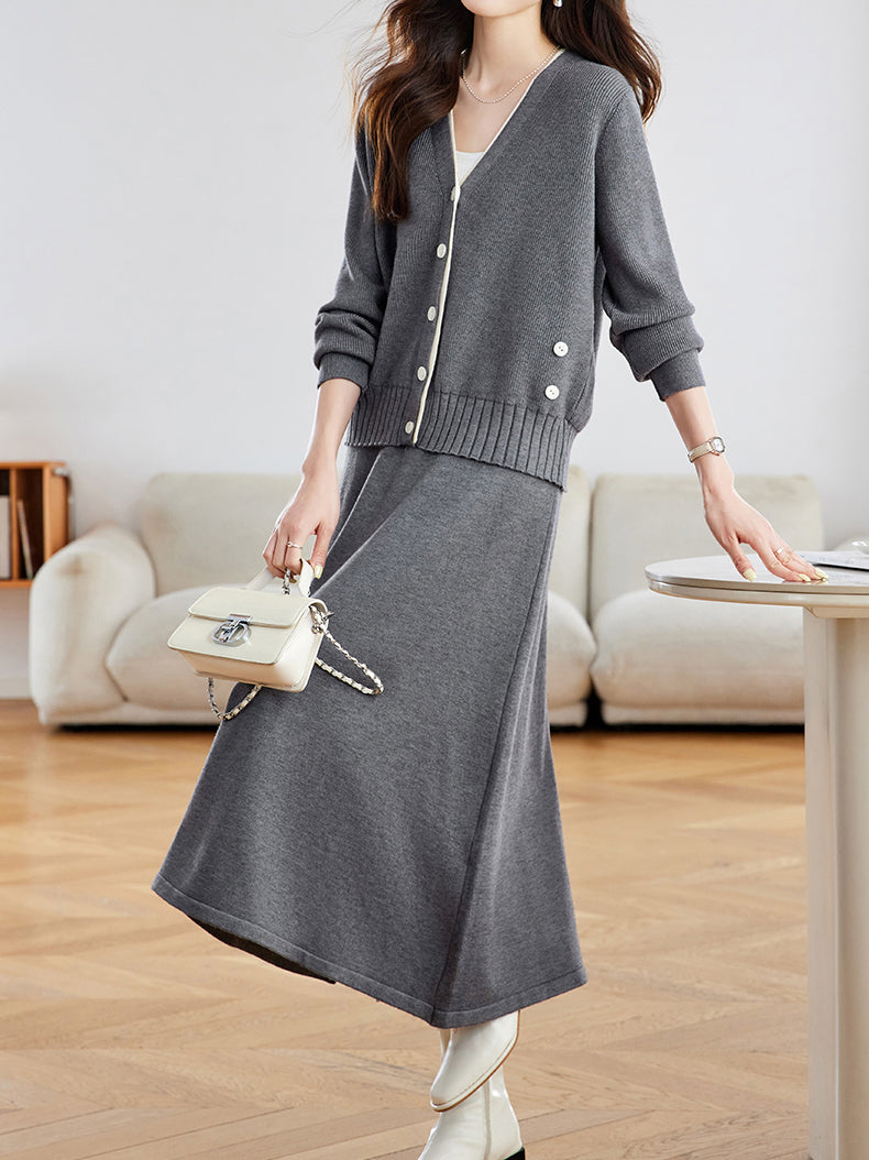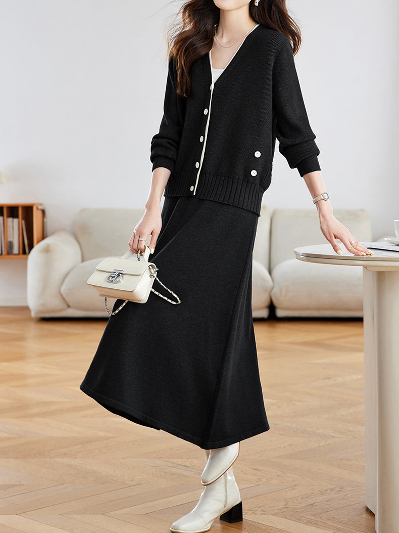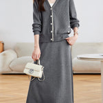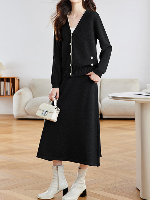 Diagonal Button Color-Patterned Cardigan + Knit Skirt Set (2 Colors)
