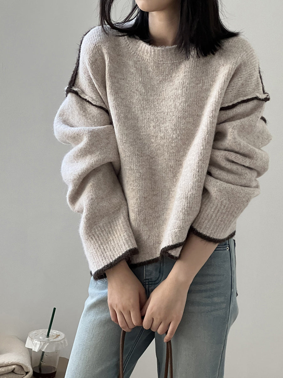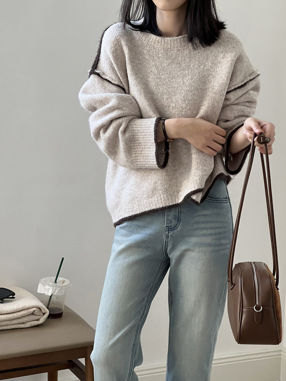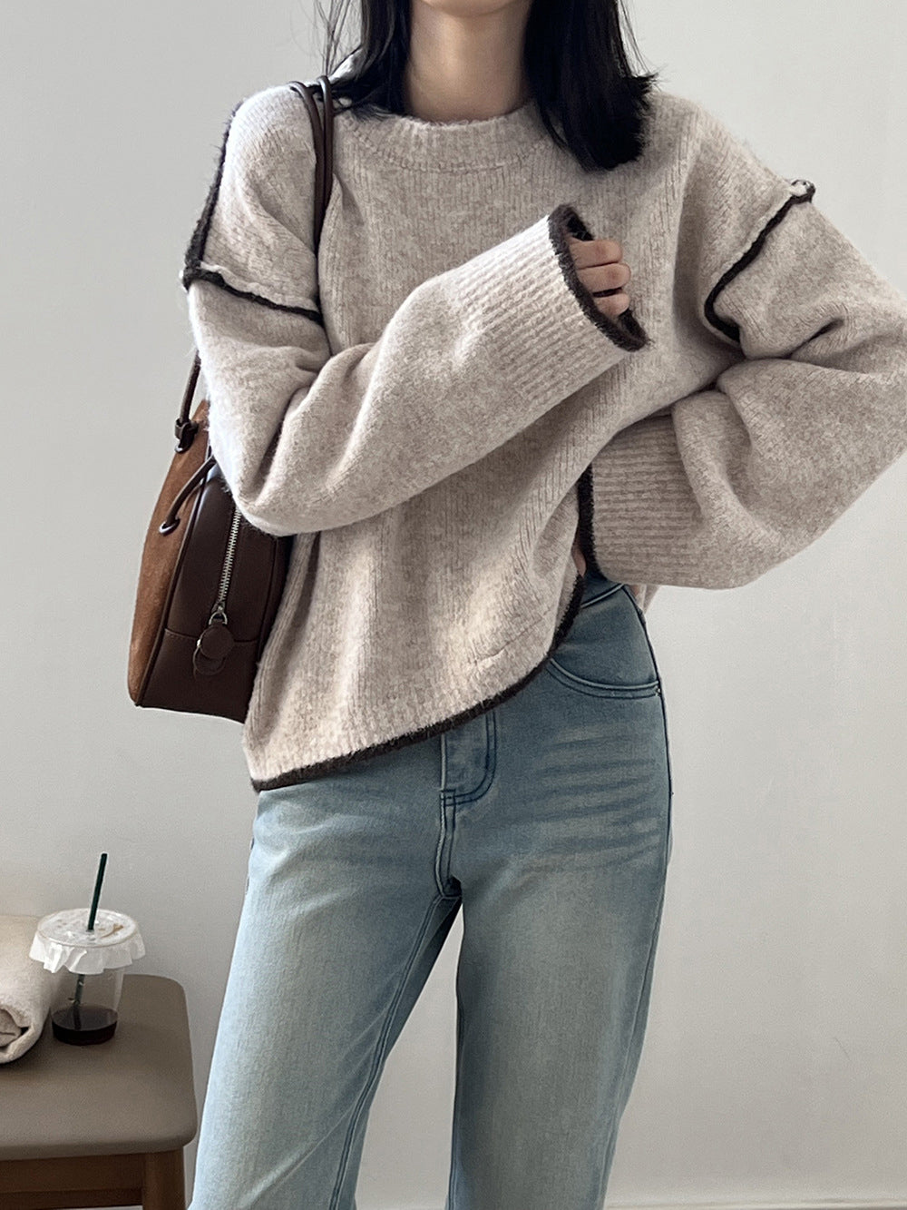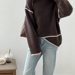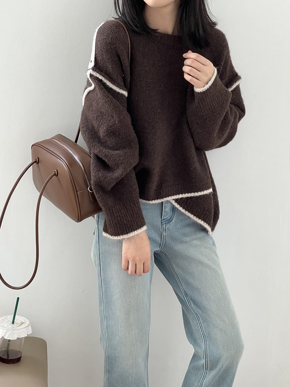 The front slit color-blocked piping knit is a sophisticated item that features a modern color scheme and delicate piping design.