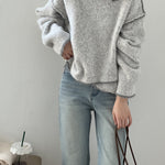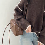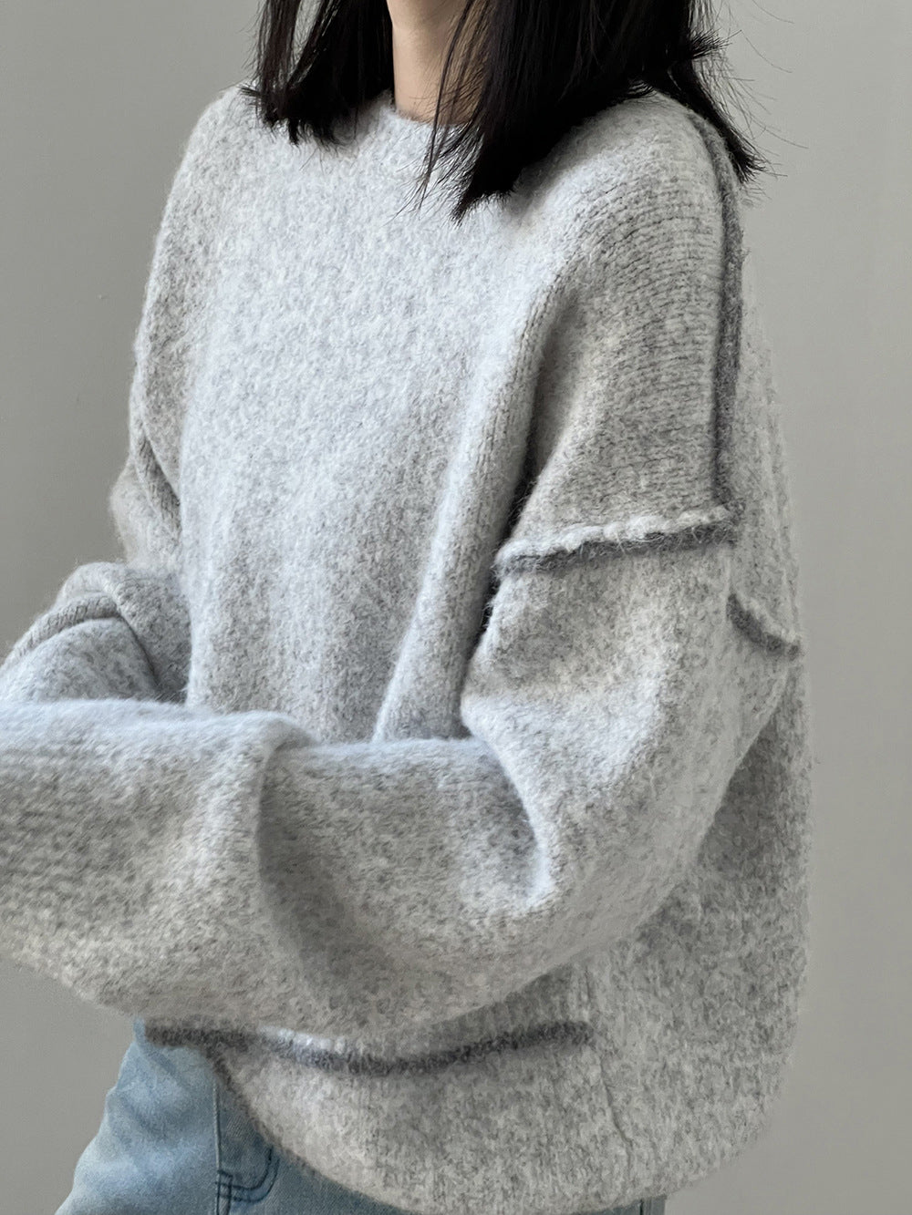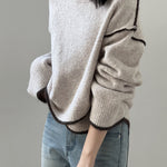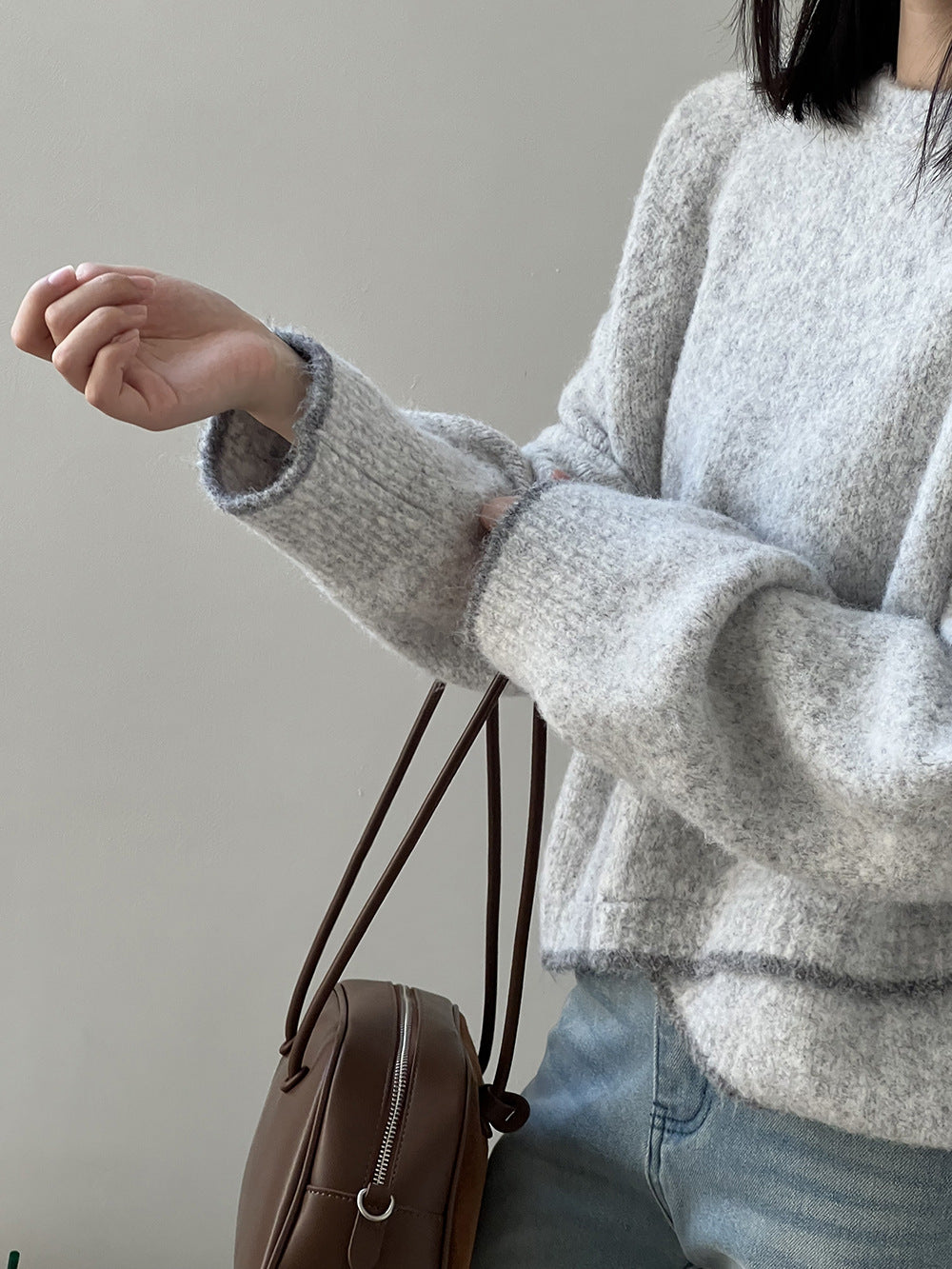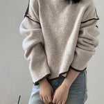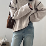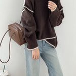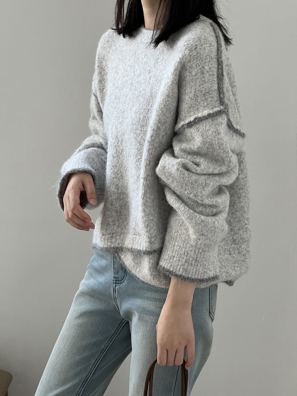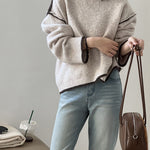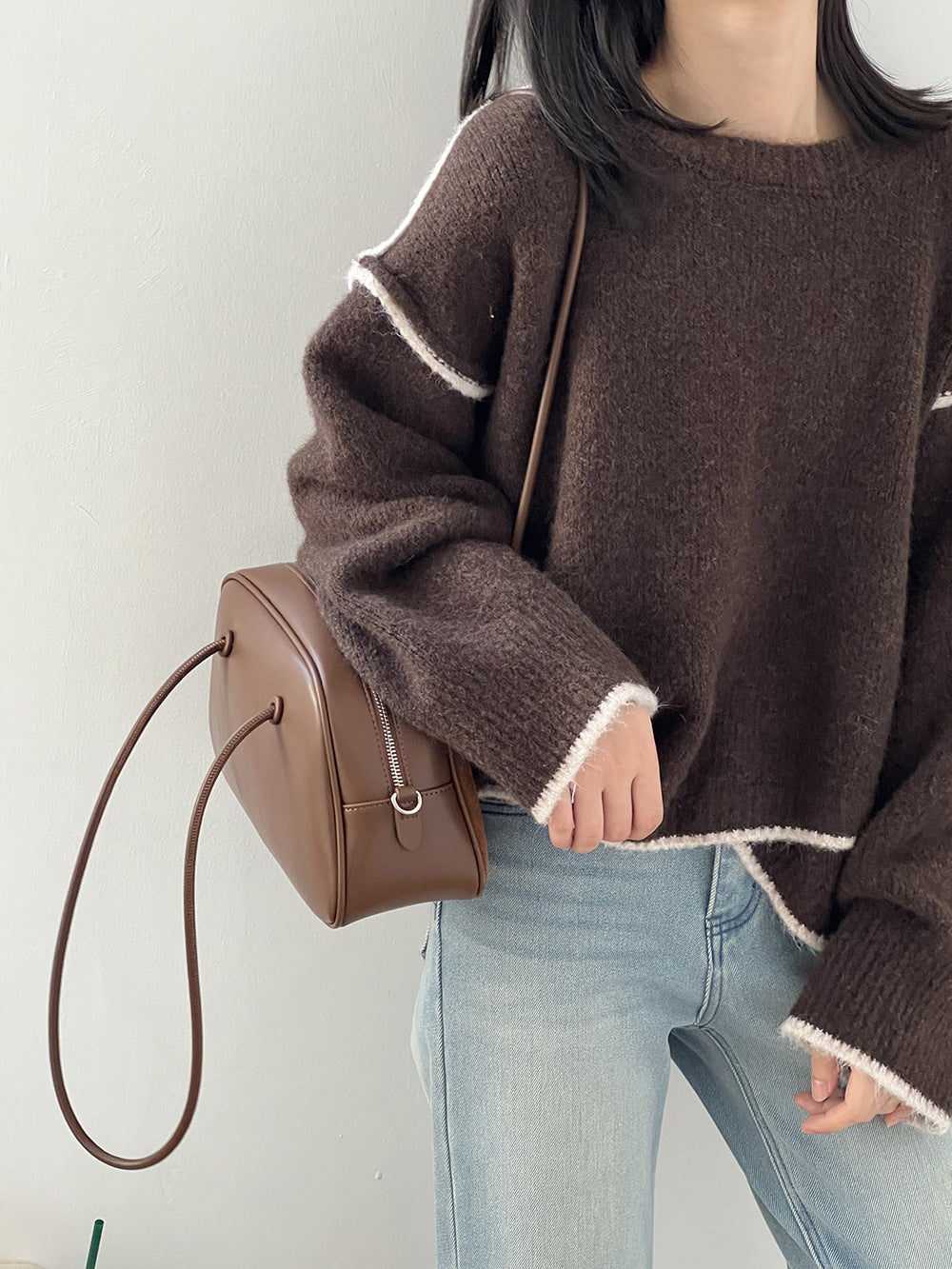 The front slit color-blocked piping knit is a sophisticated item that features a modern color scheme and delicate piping design.