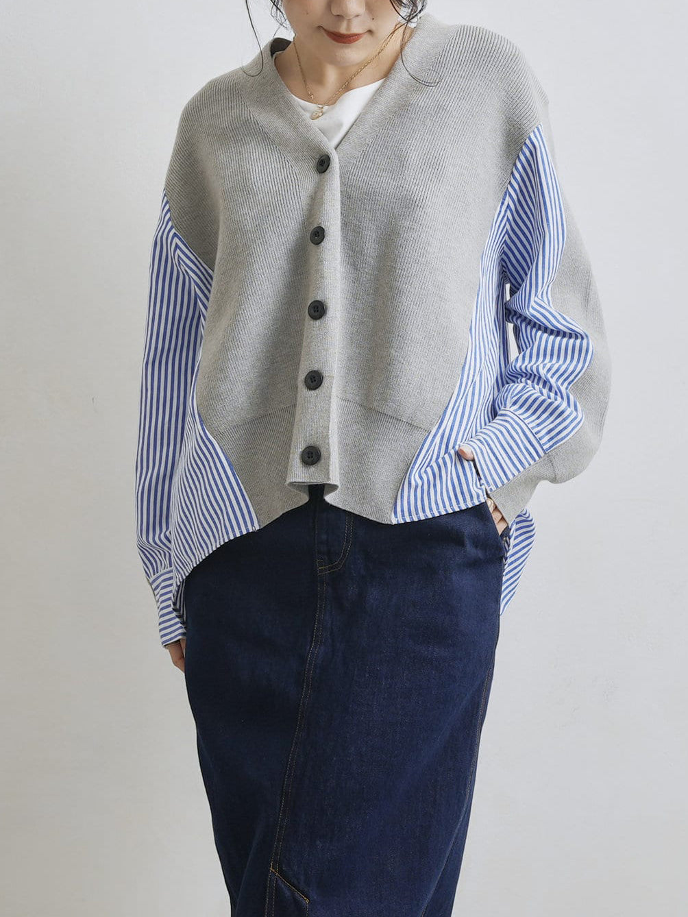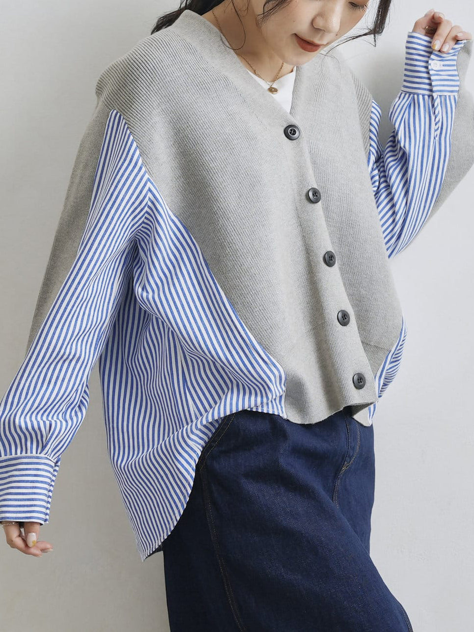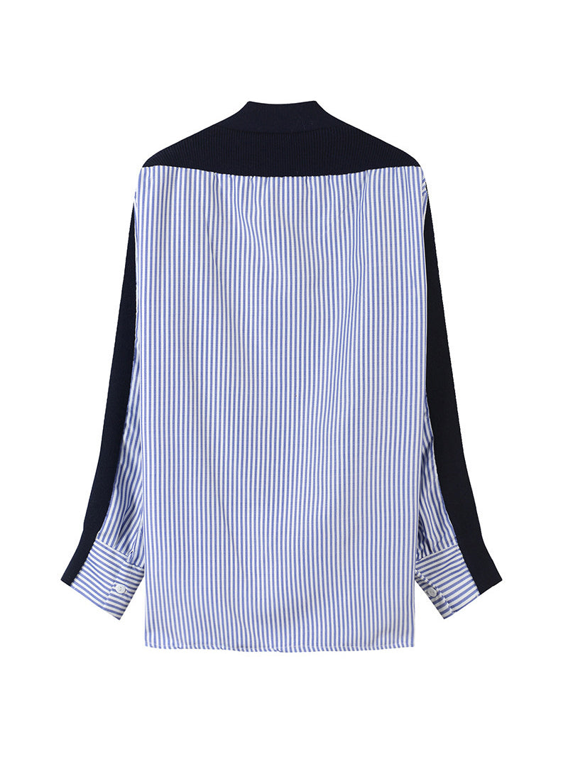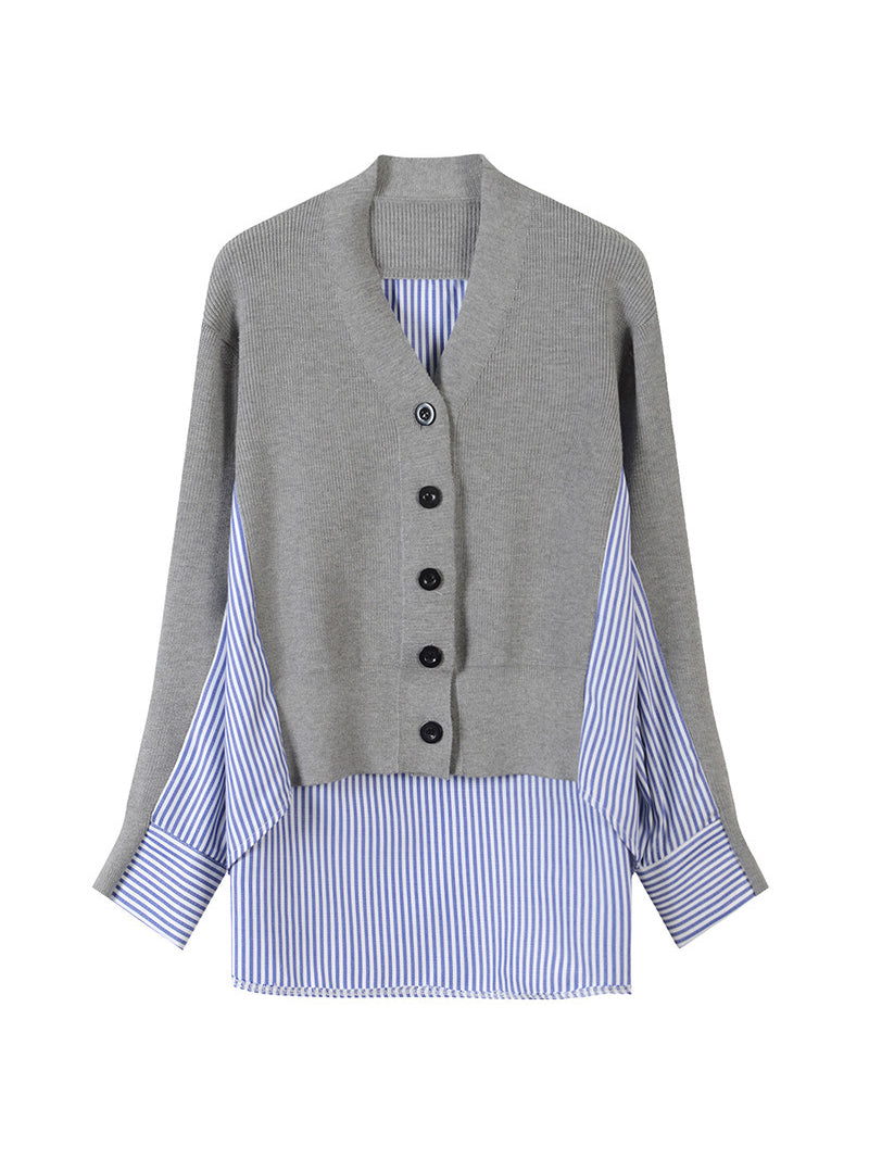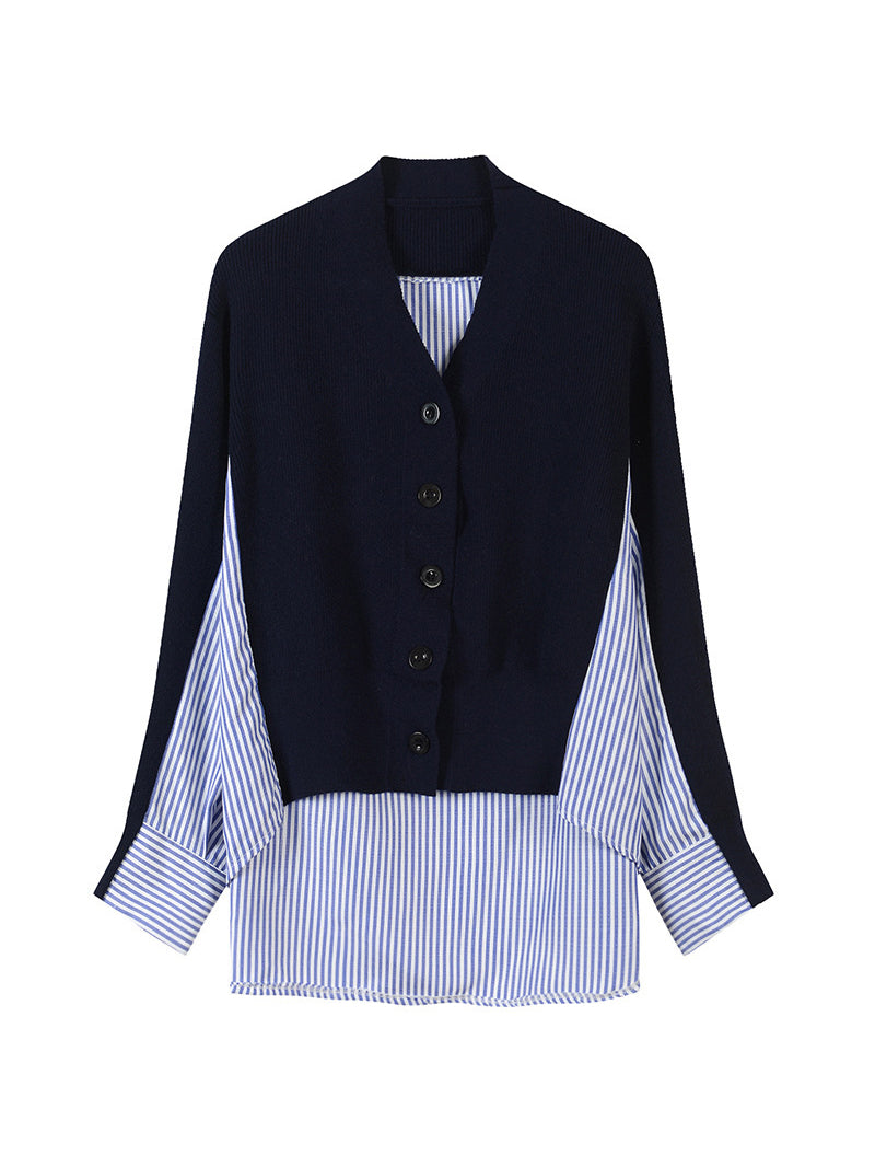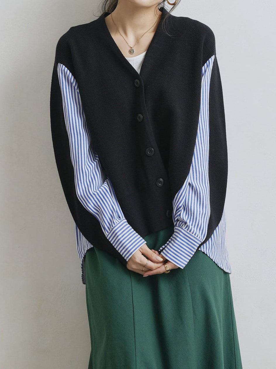 V-neck striped shirt docking cardigan in 2 colors