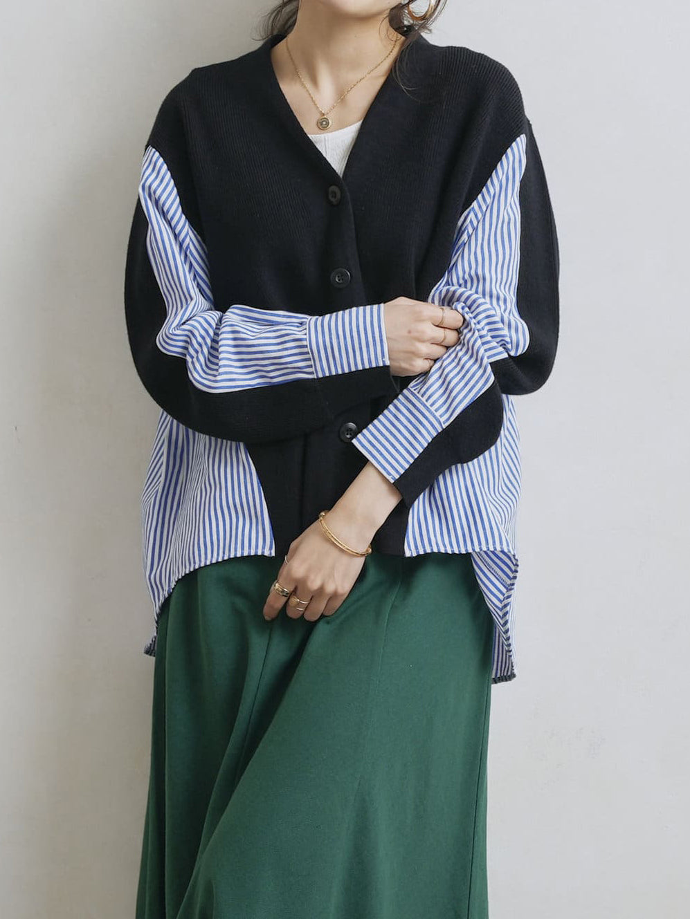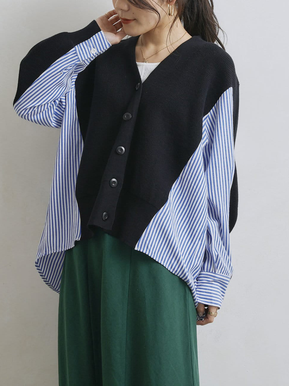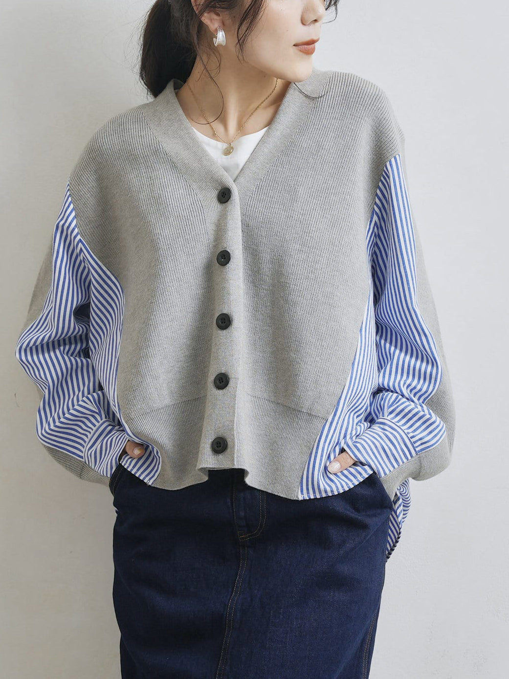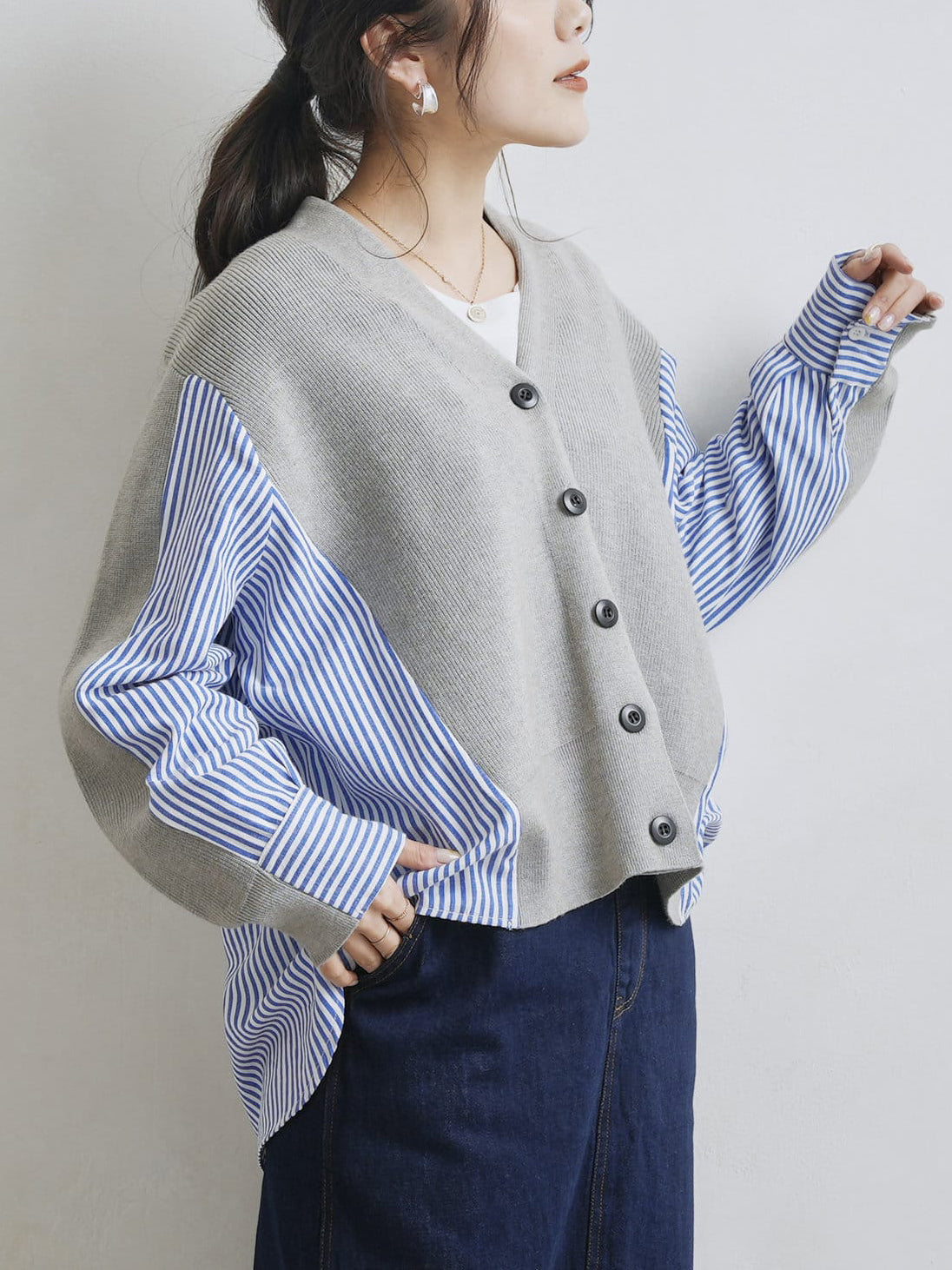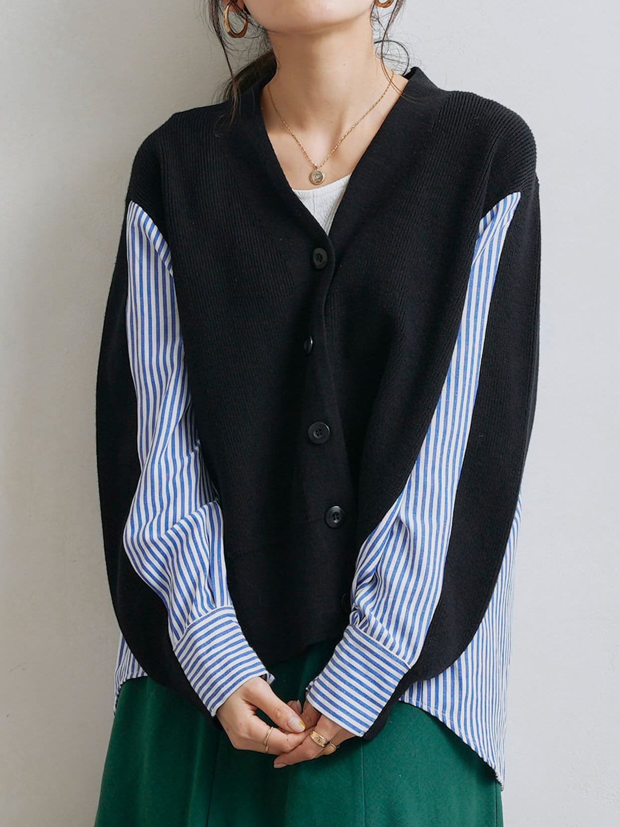 V-neck striped shirt docking cardigan in 2 colors
