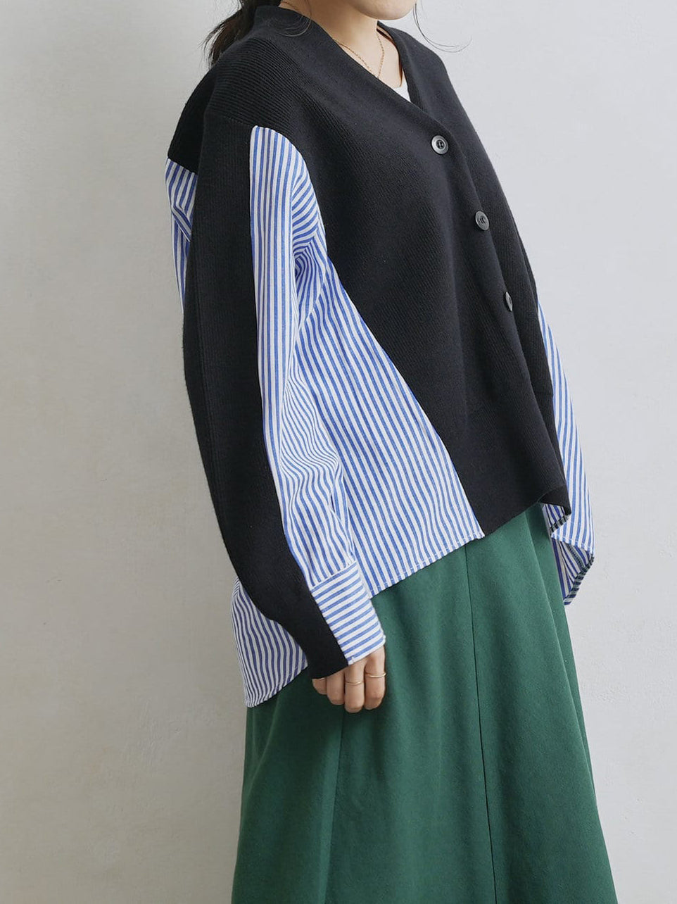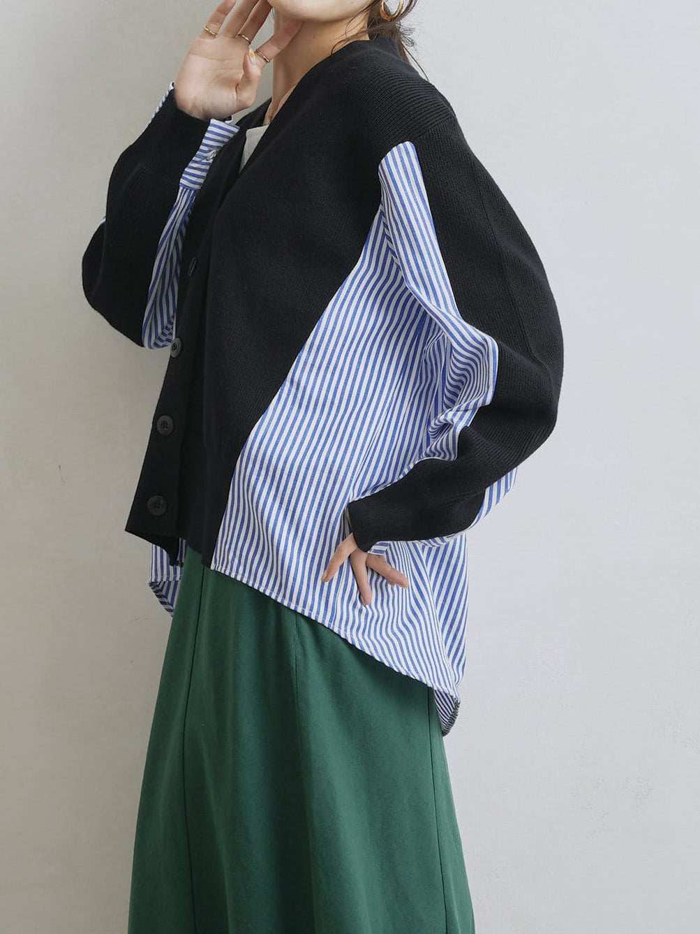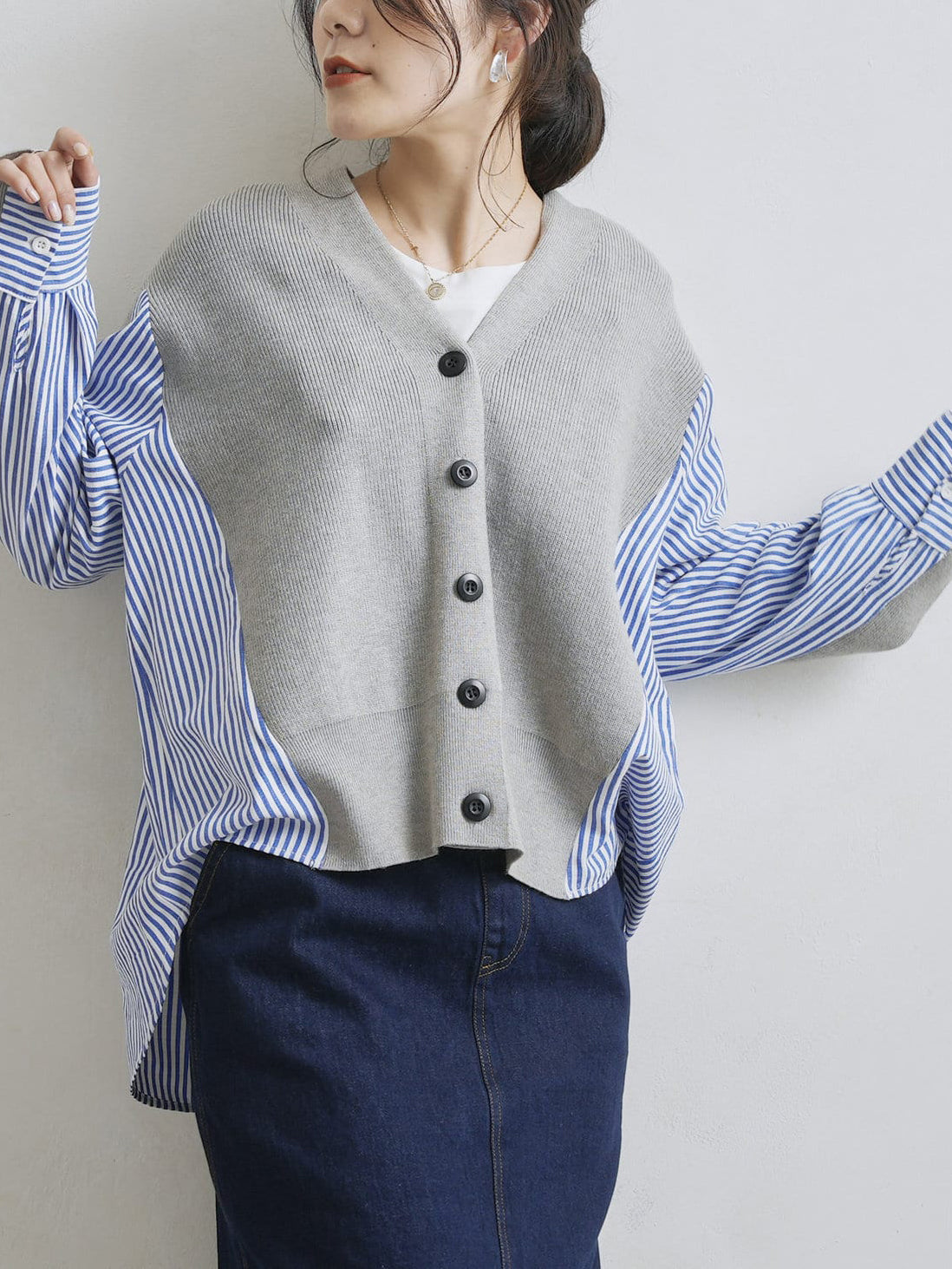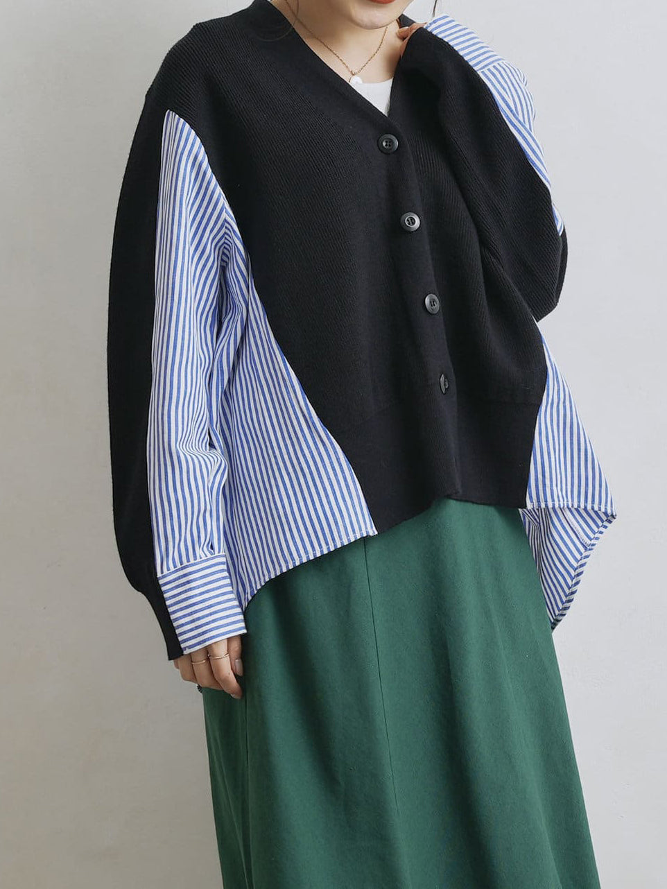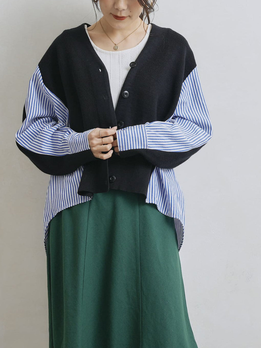 V-neck striped shirt docking cardigan in 2 colors