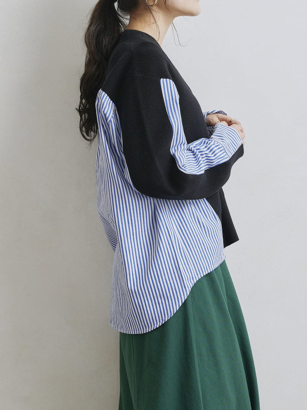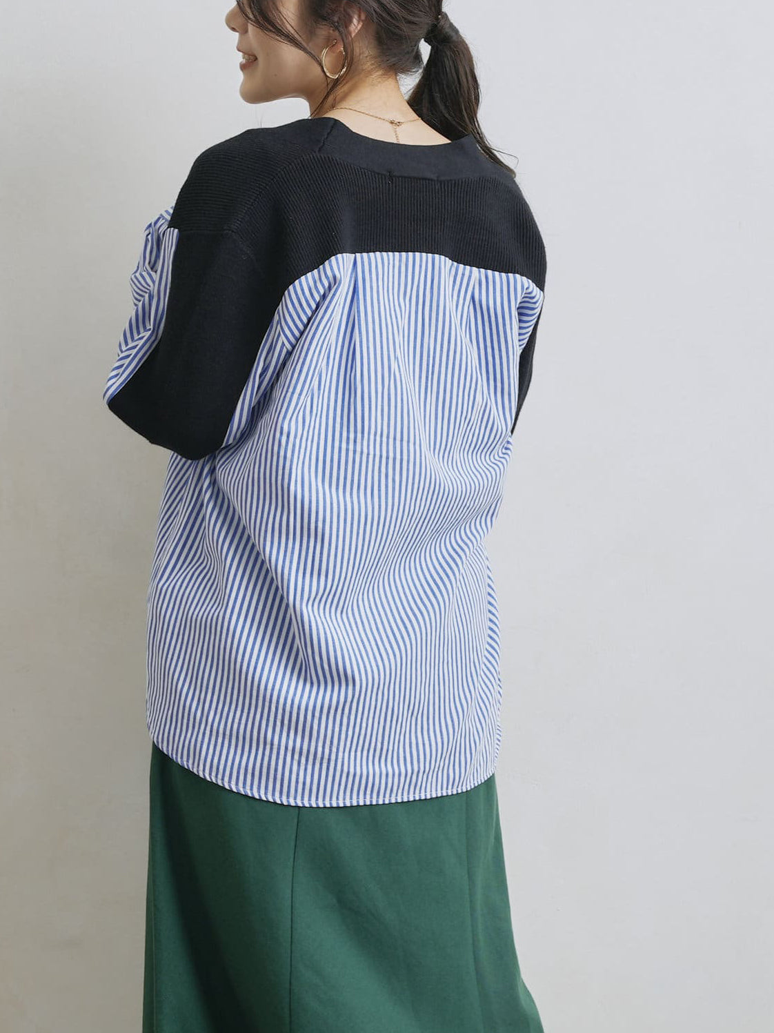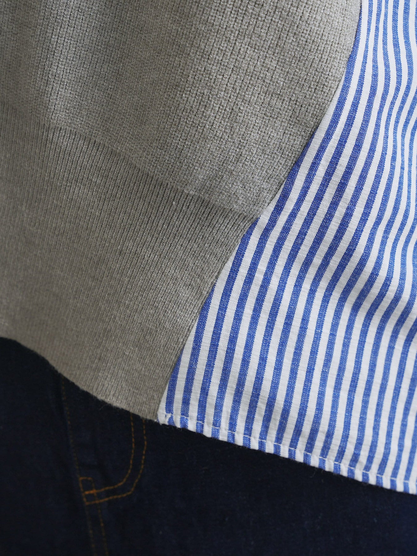 A top with a unique knit and shirt design made from different materials.