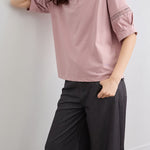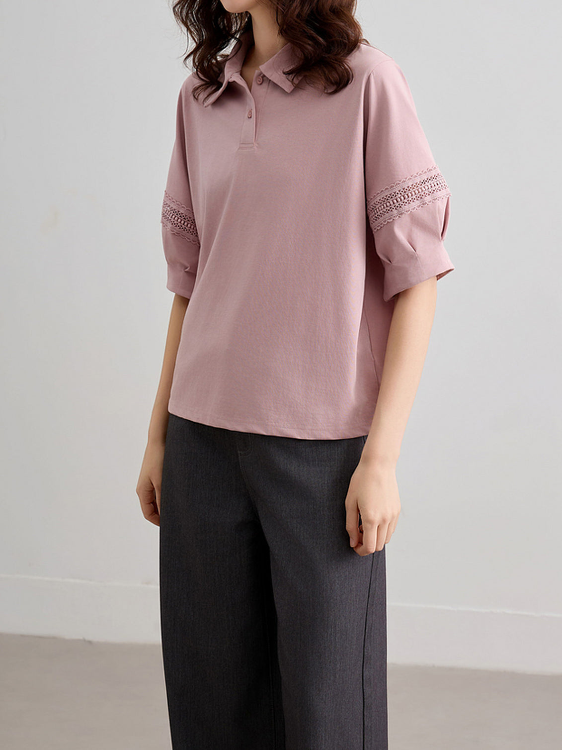 フォルムを付けた袖の中央辺りに繊細なレースをドッキングしたブラウス。