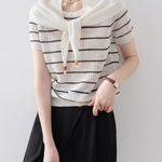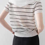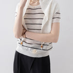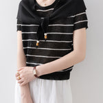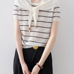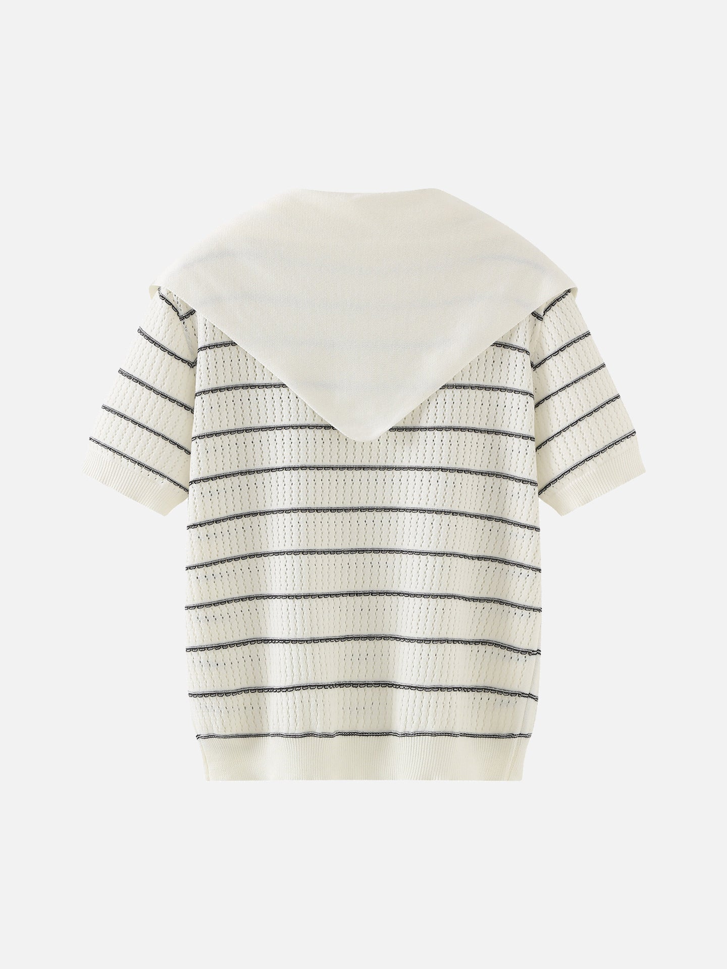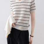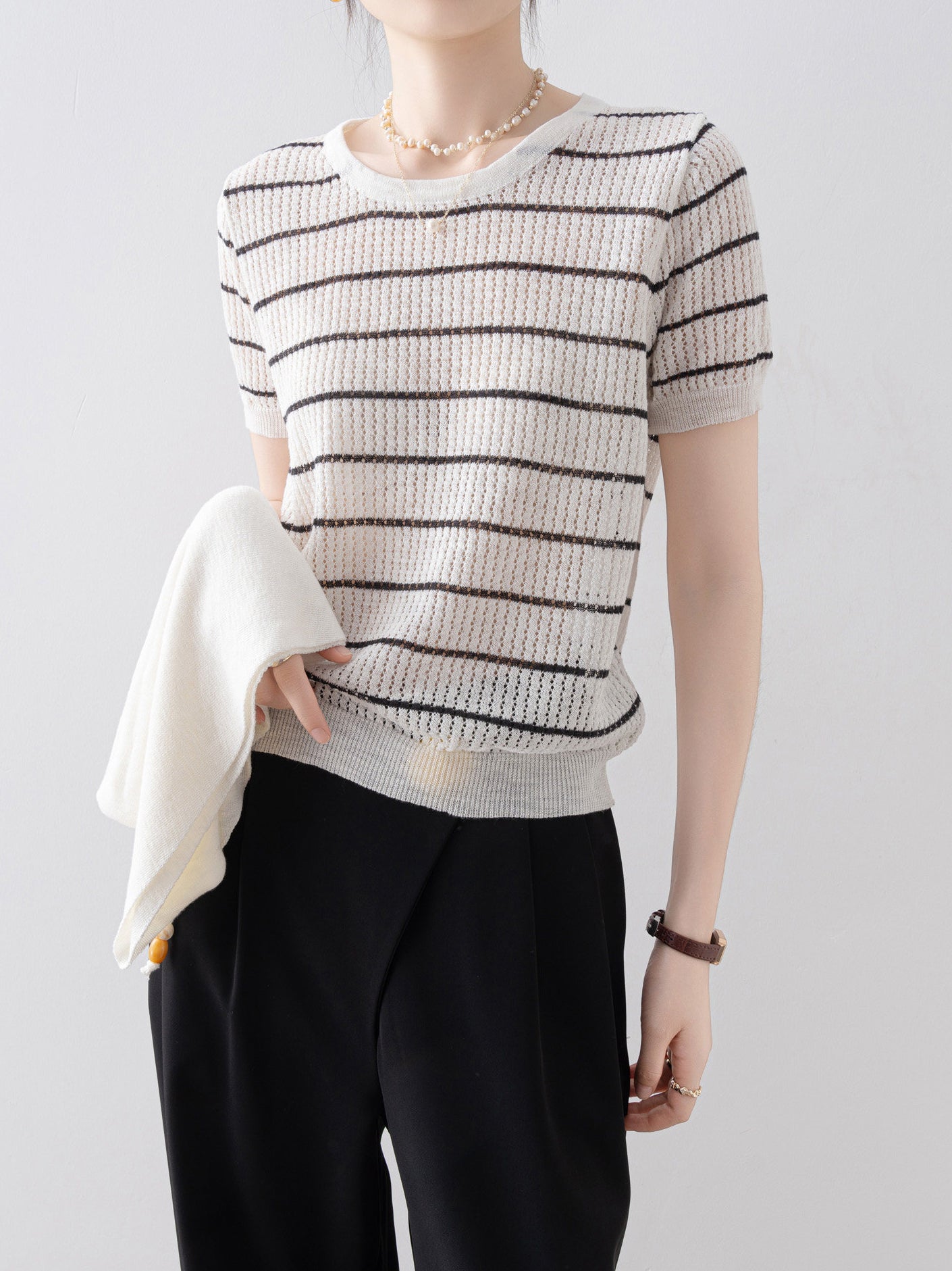 クリーンなパネルボーダーデザインに、シアーニットでヘルシーな女性らしさをプラスした一着です。