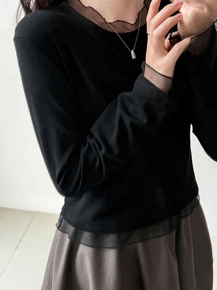 襟元と袖口に繊細なチュールをあしらったカットソー。