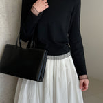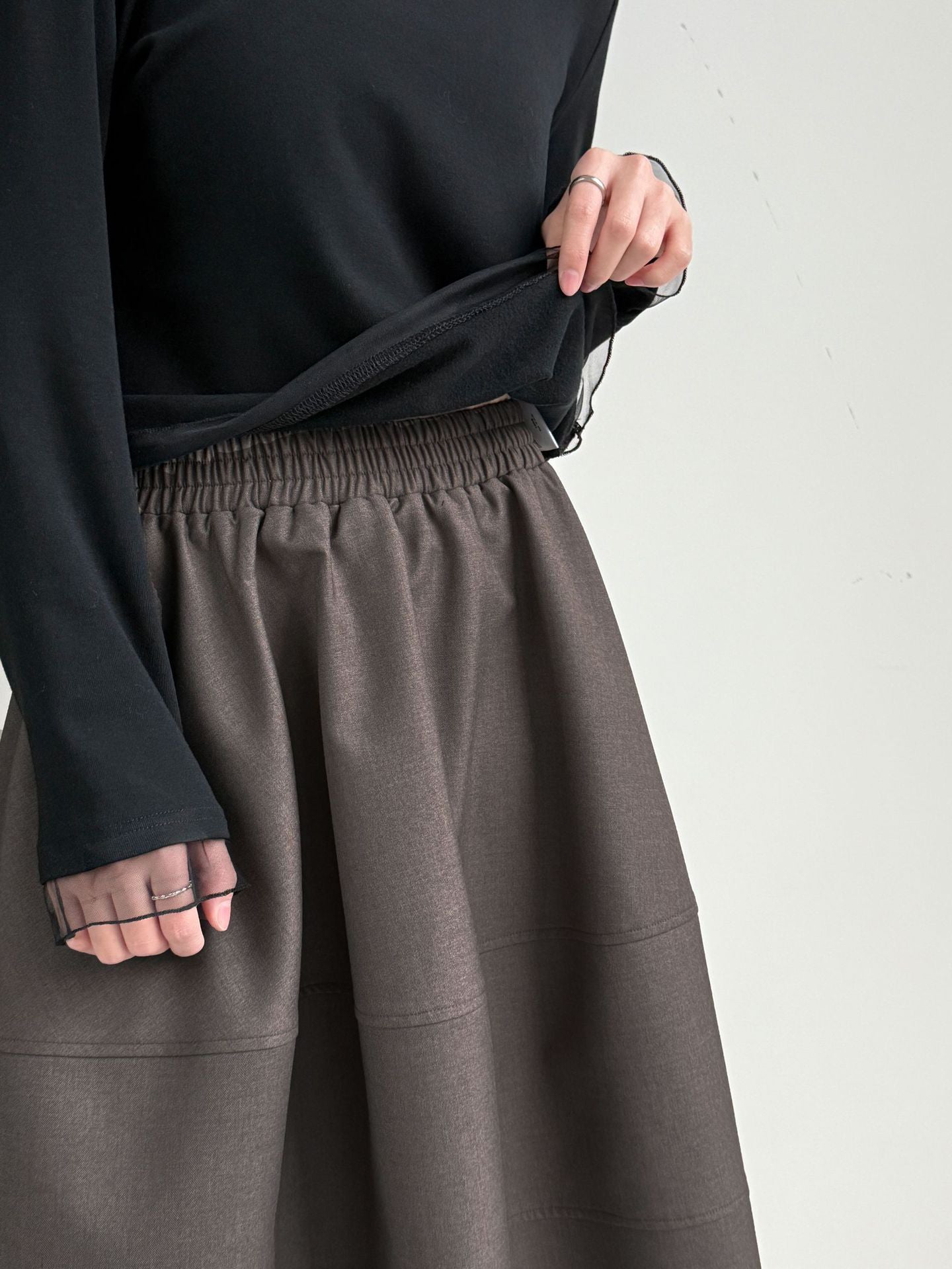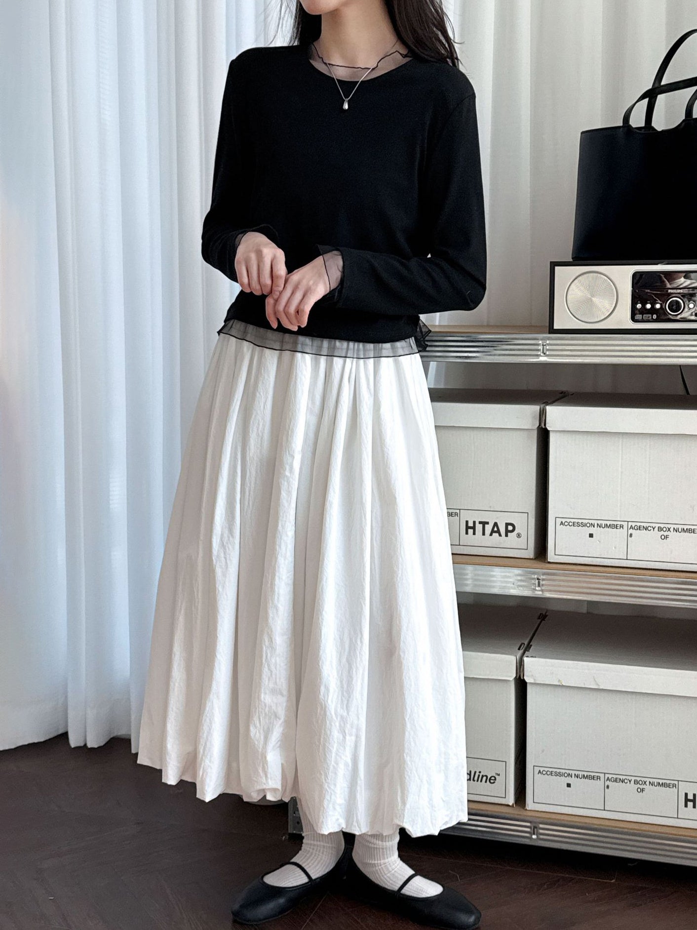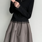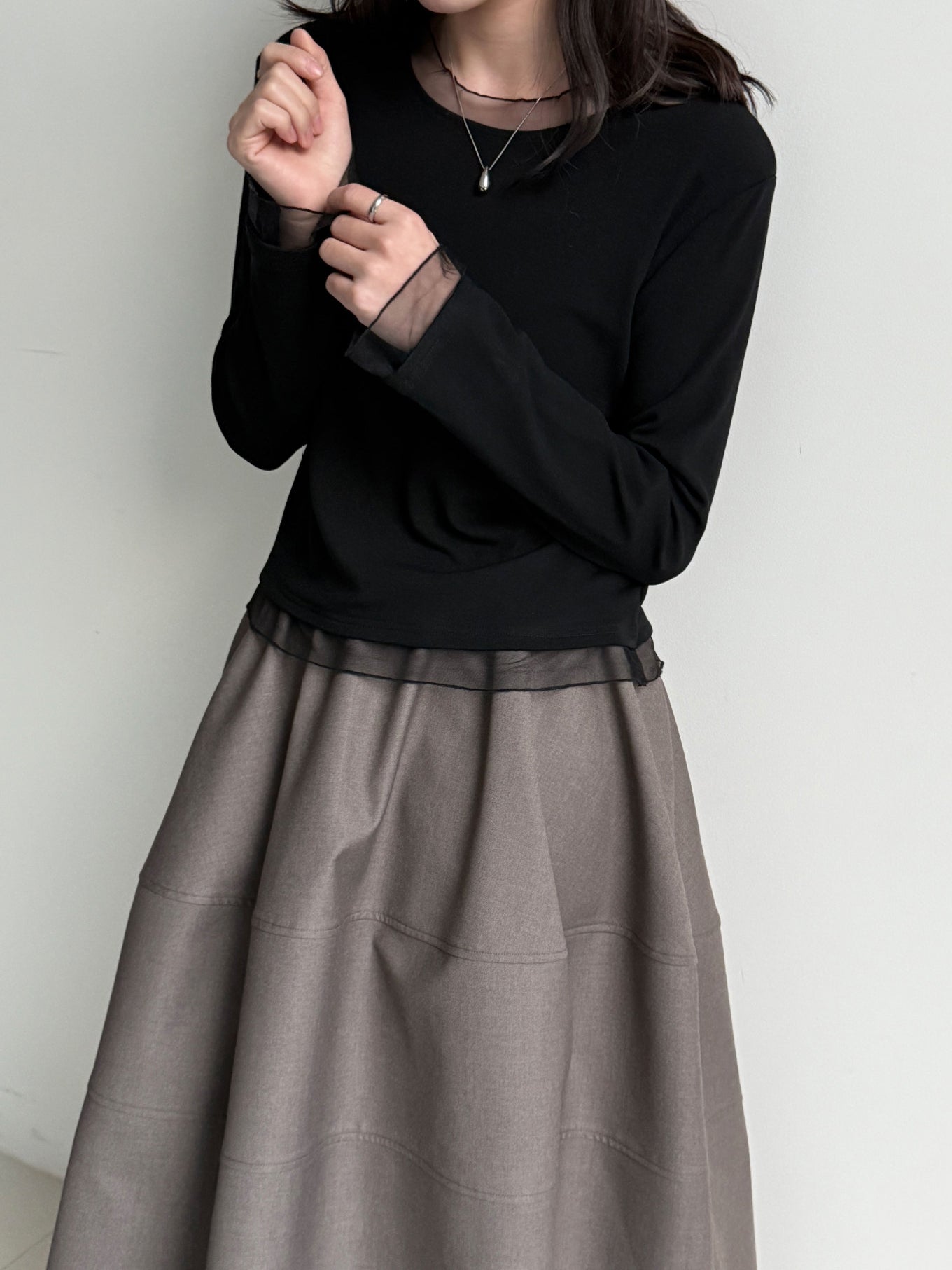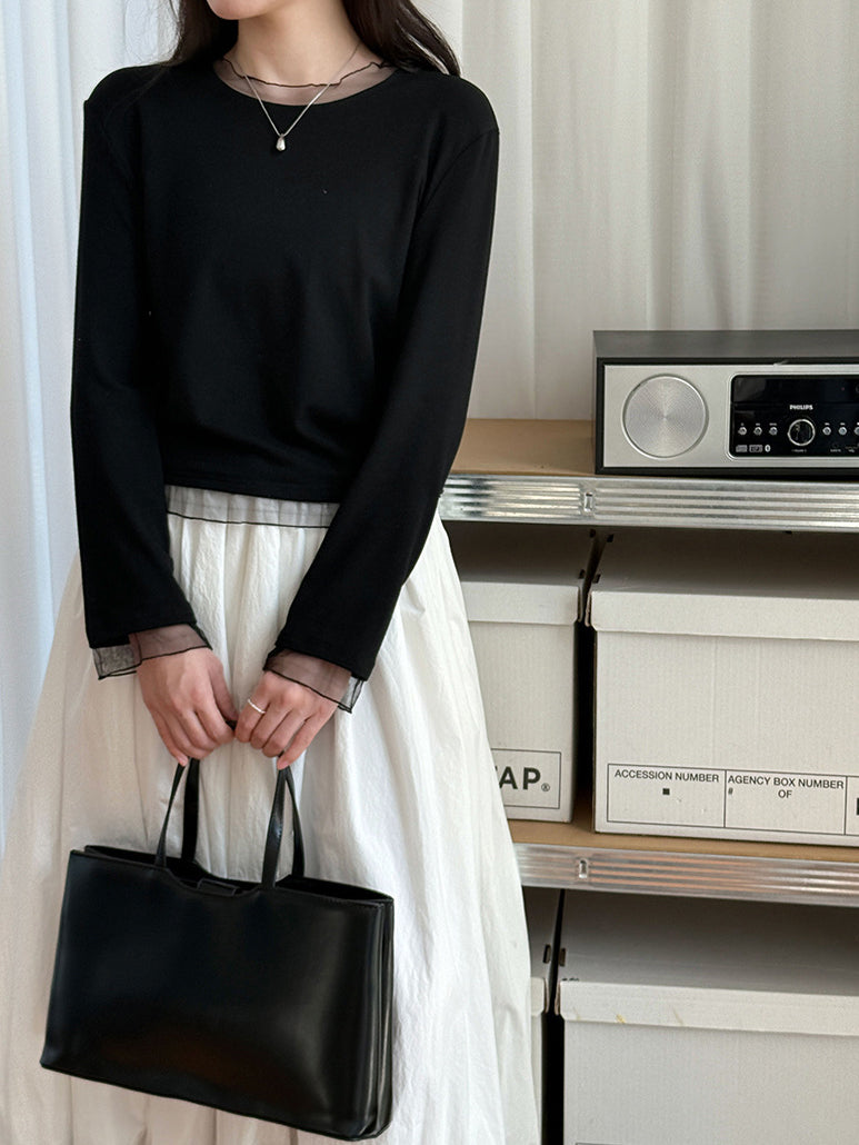 透け感のあるチュール素材を組み合わせ、シンプルながらも着映えする一枚です。