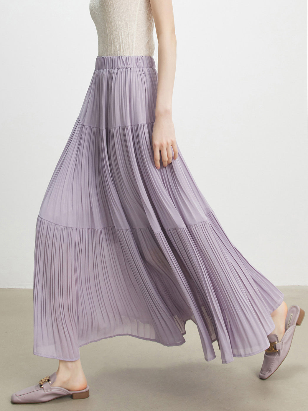 動くたびにふわりと表情豊かなプリーツデザインは、視線を惹きつけています。