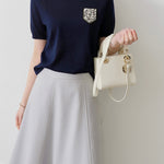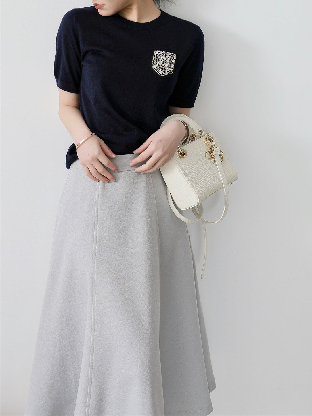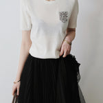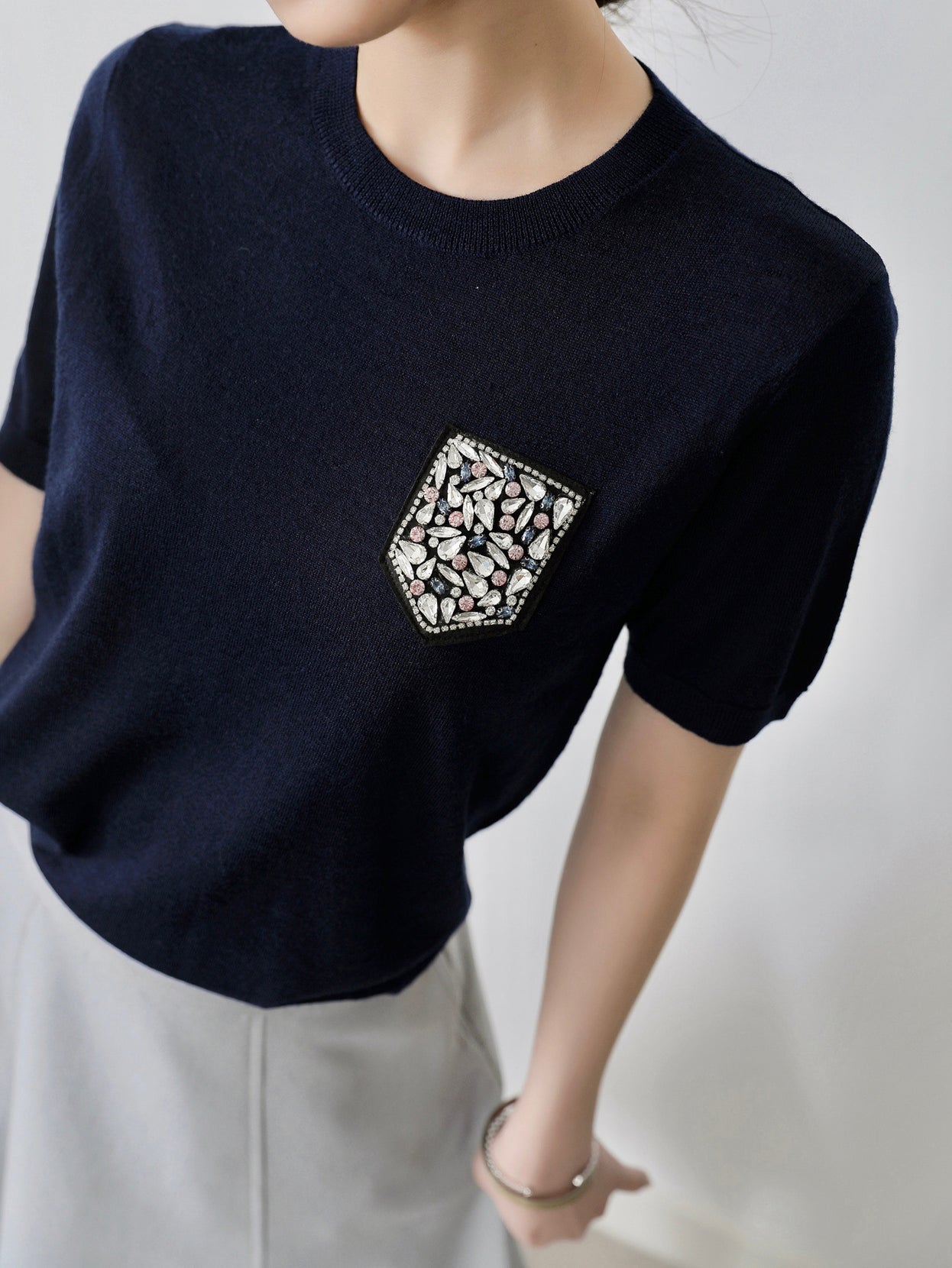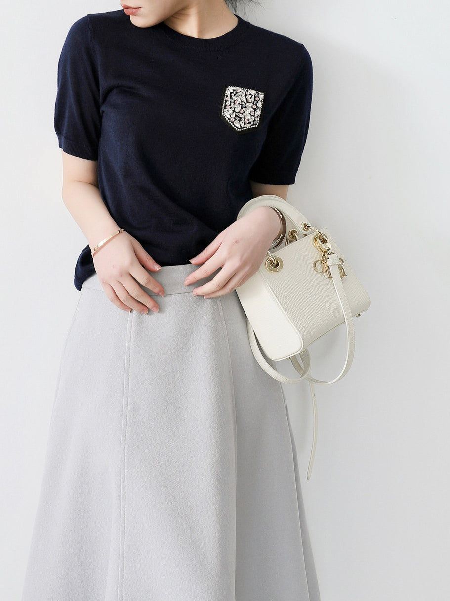 ホームベース型ビーズ飾り半袖ニット 2色入