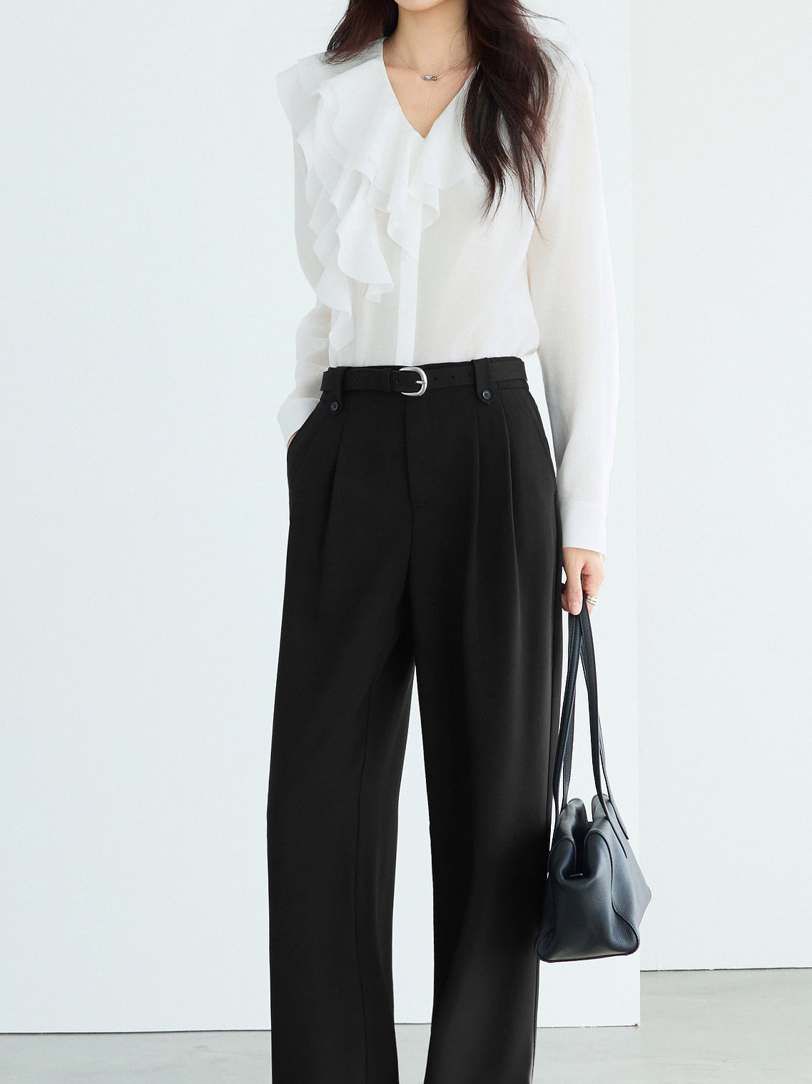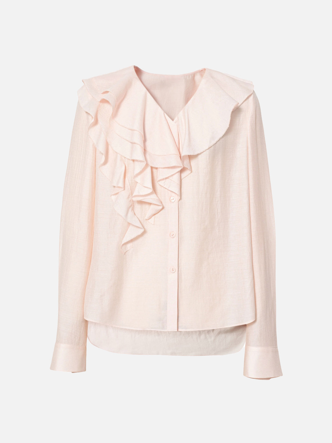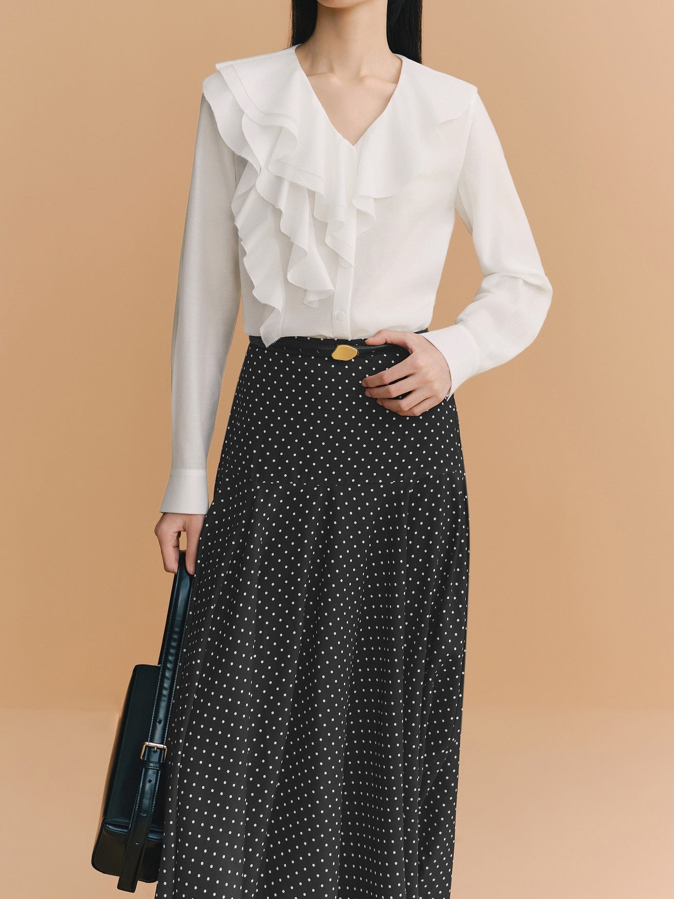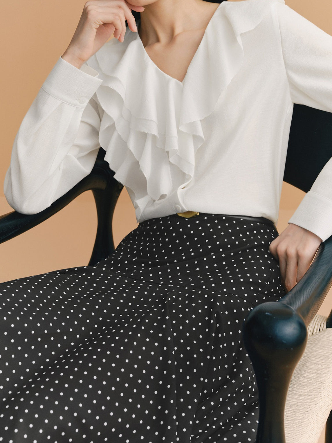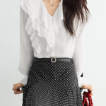 Vネックとマルチなラッフルのバランスが上品な抜け感を演出します。