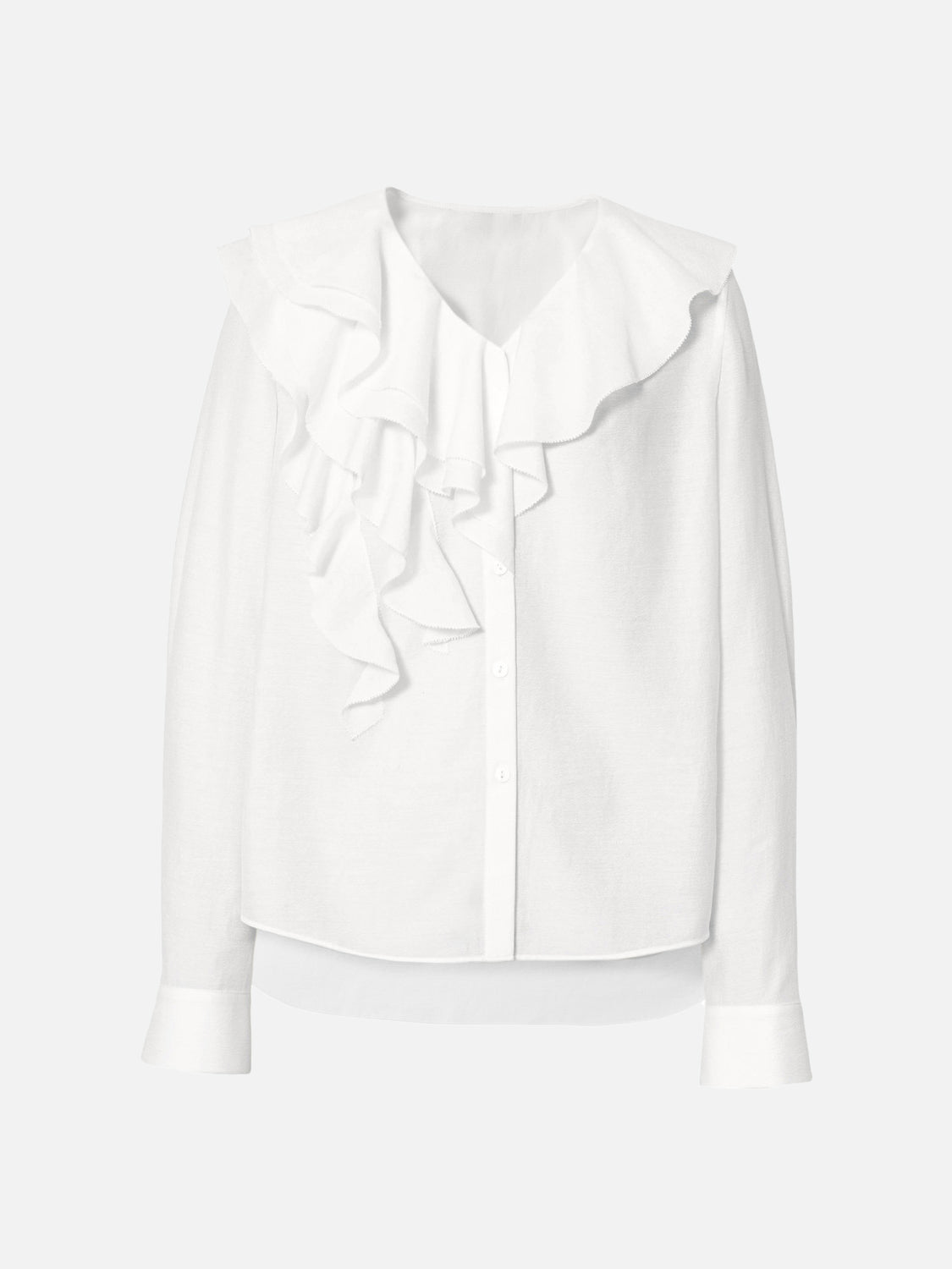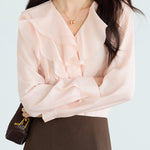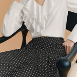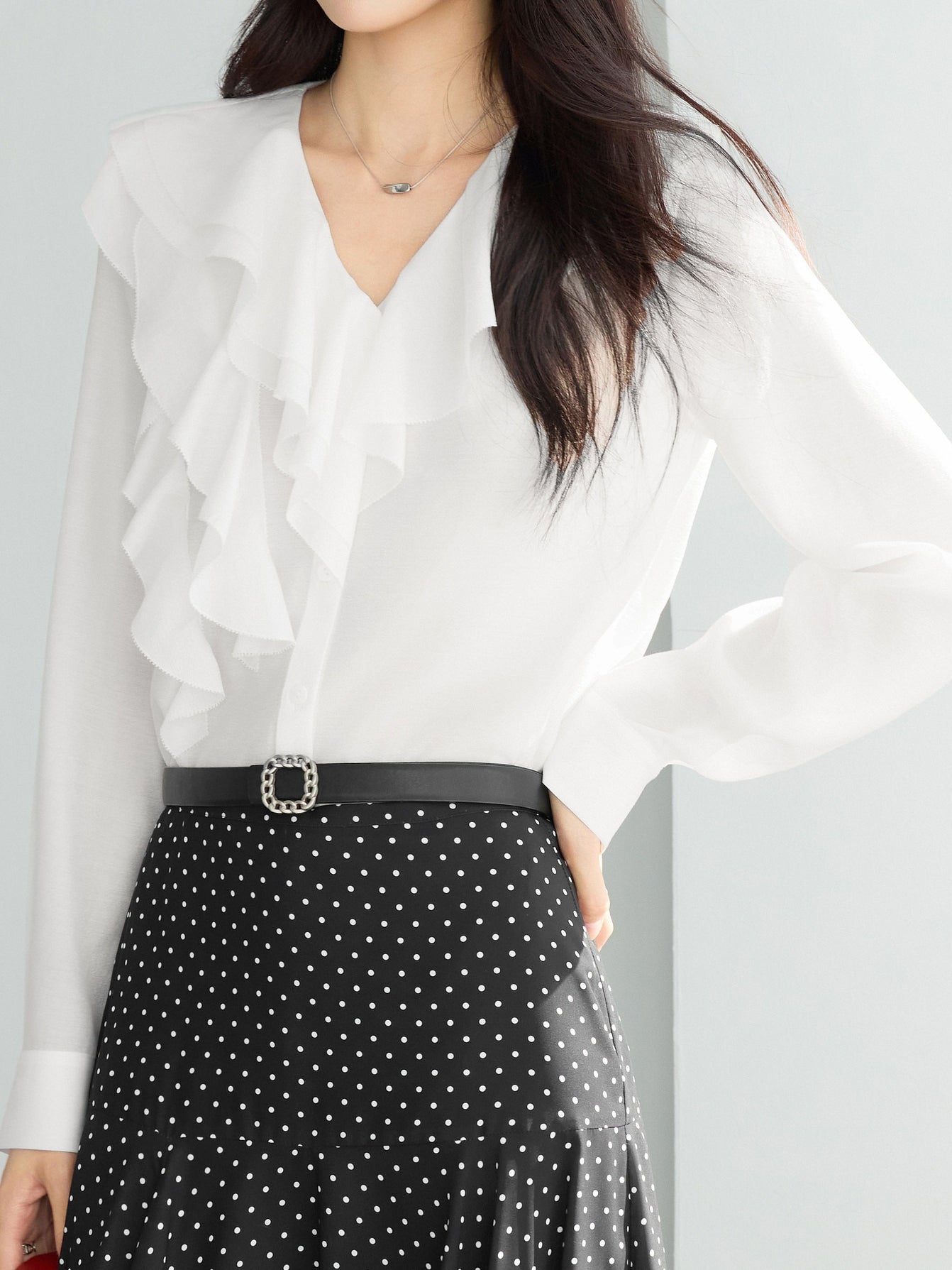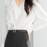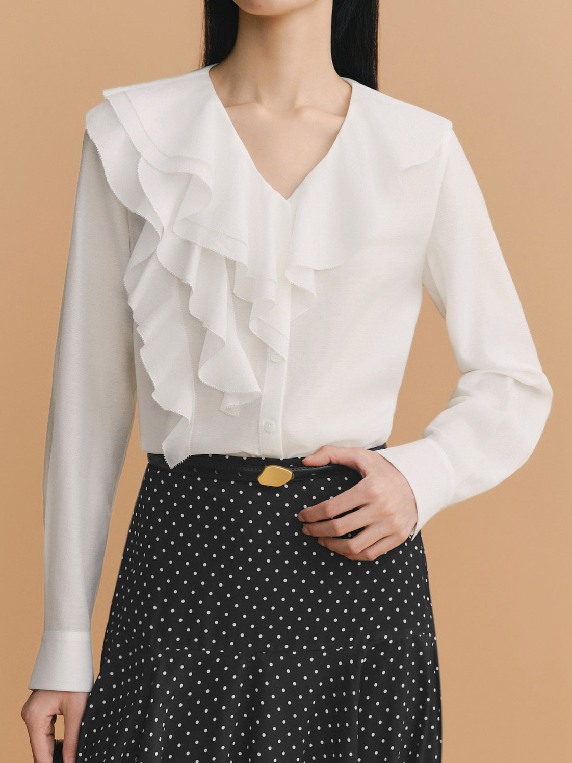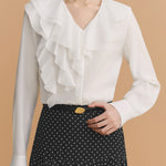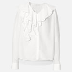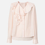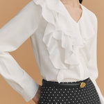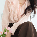 ふんわりとしたラッフルが映える、品よく決まるなブラウス。