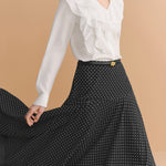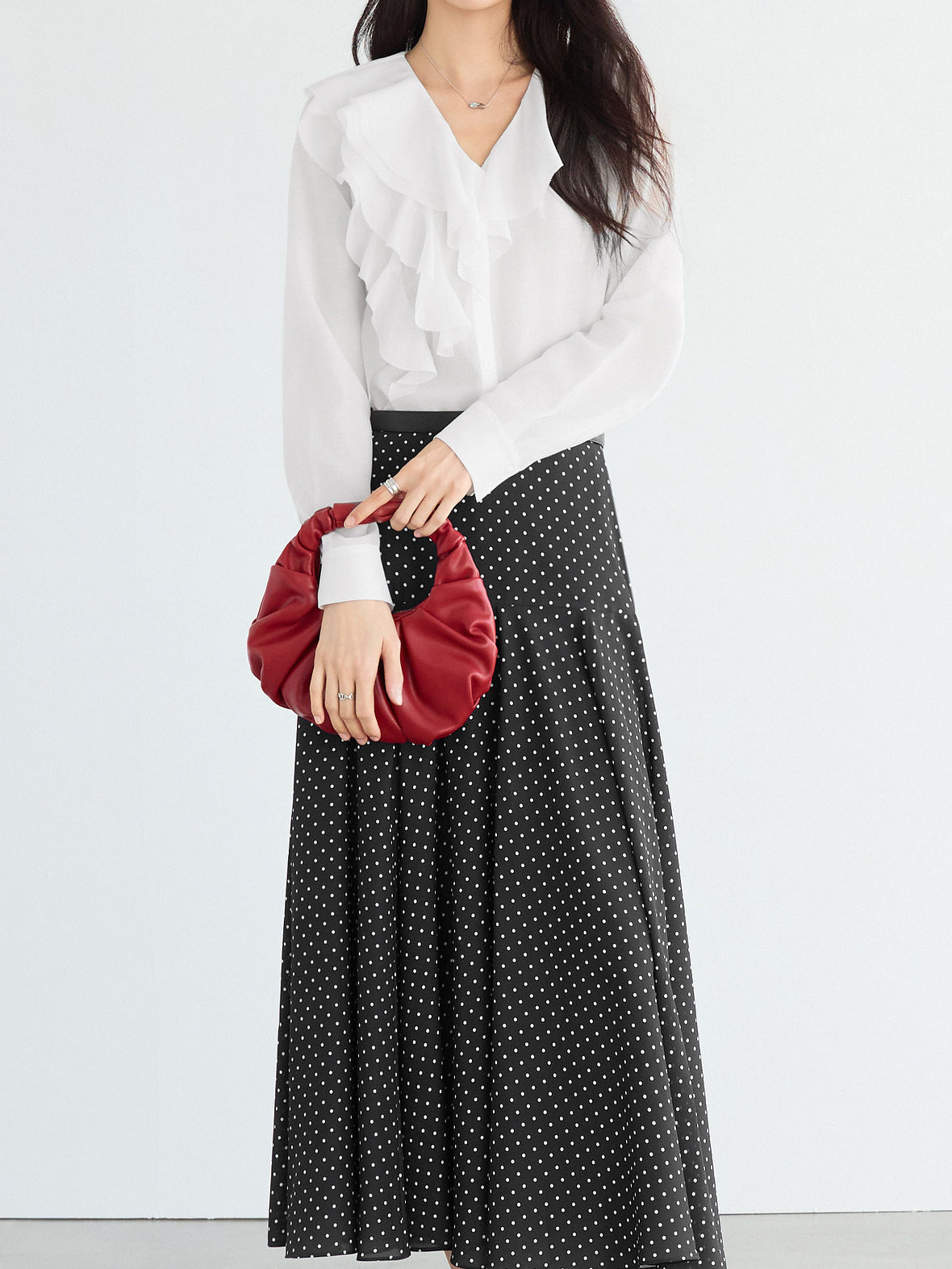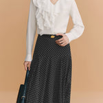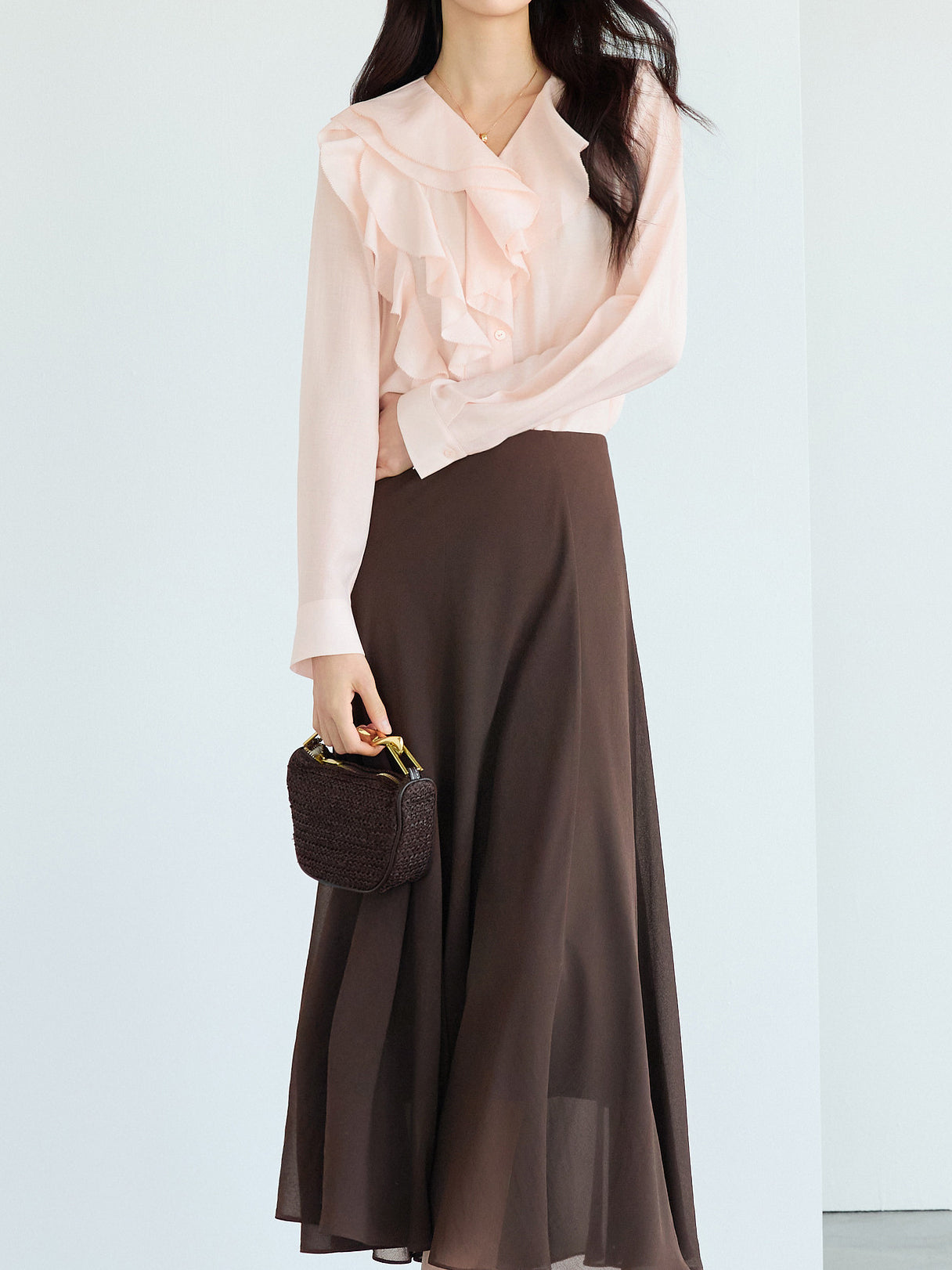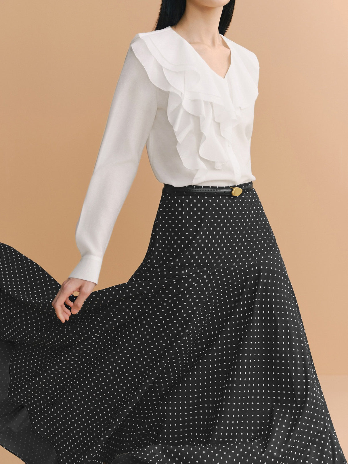 ふんわりとしたラッフルが映える、品よく決まるなブラウス。