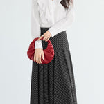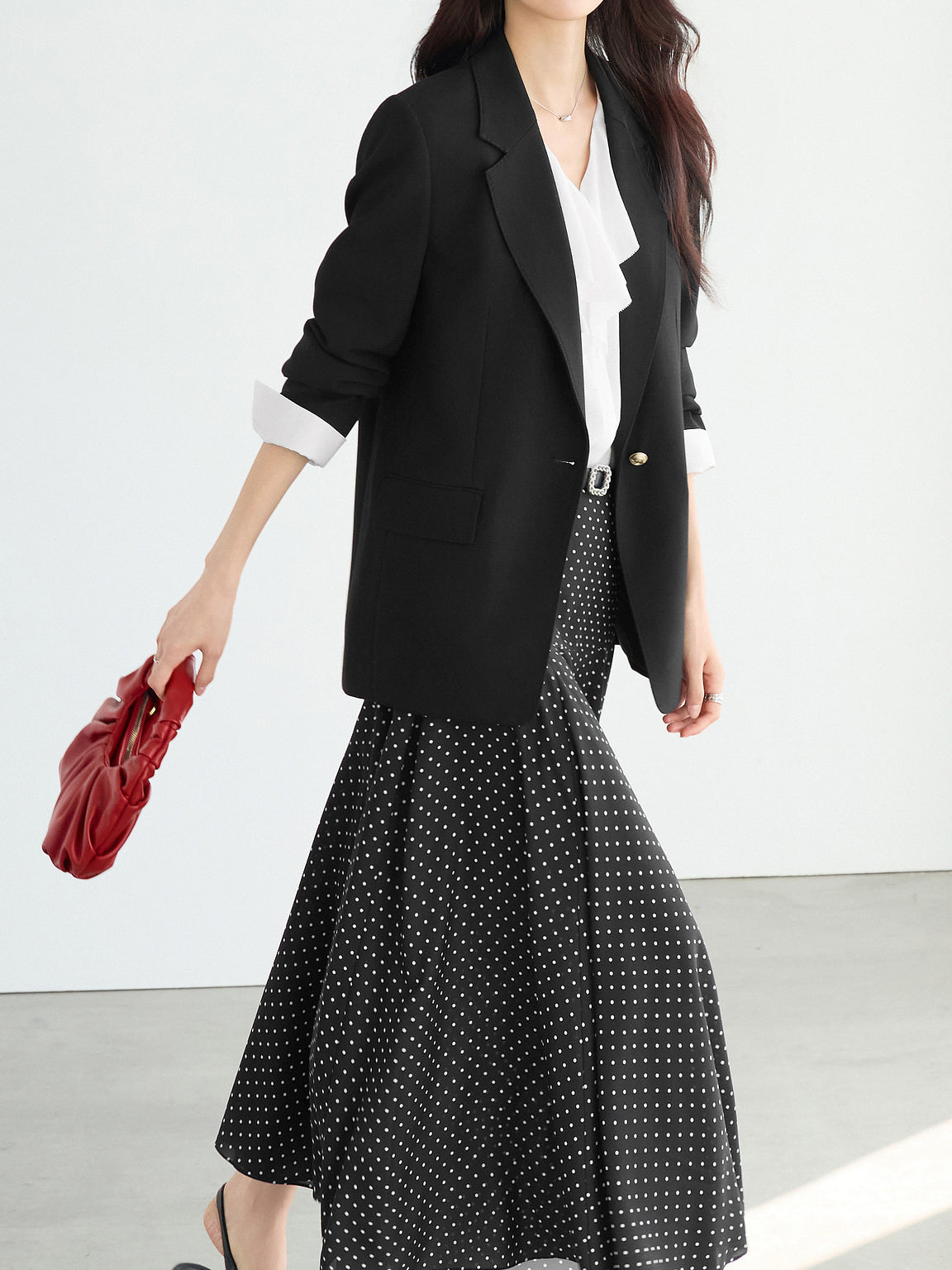 ・パールのネックレスとパンプスをプラスして、上品さを演出できます。