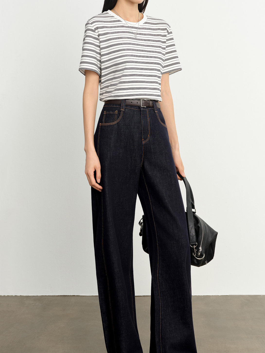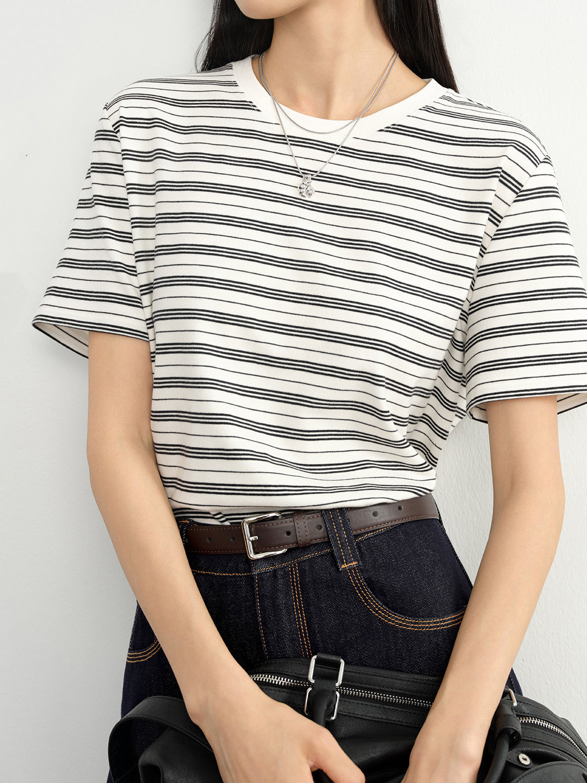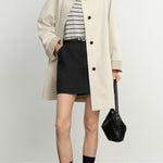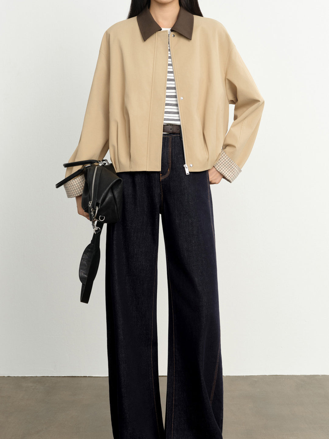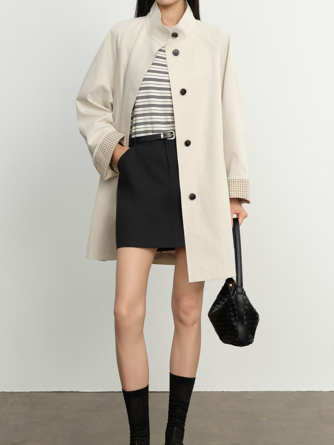 モノトーンの配色と、コンパクトな丈感のバランスでスタイルアップを叶えます。