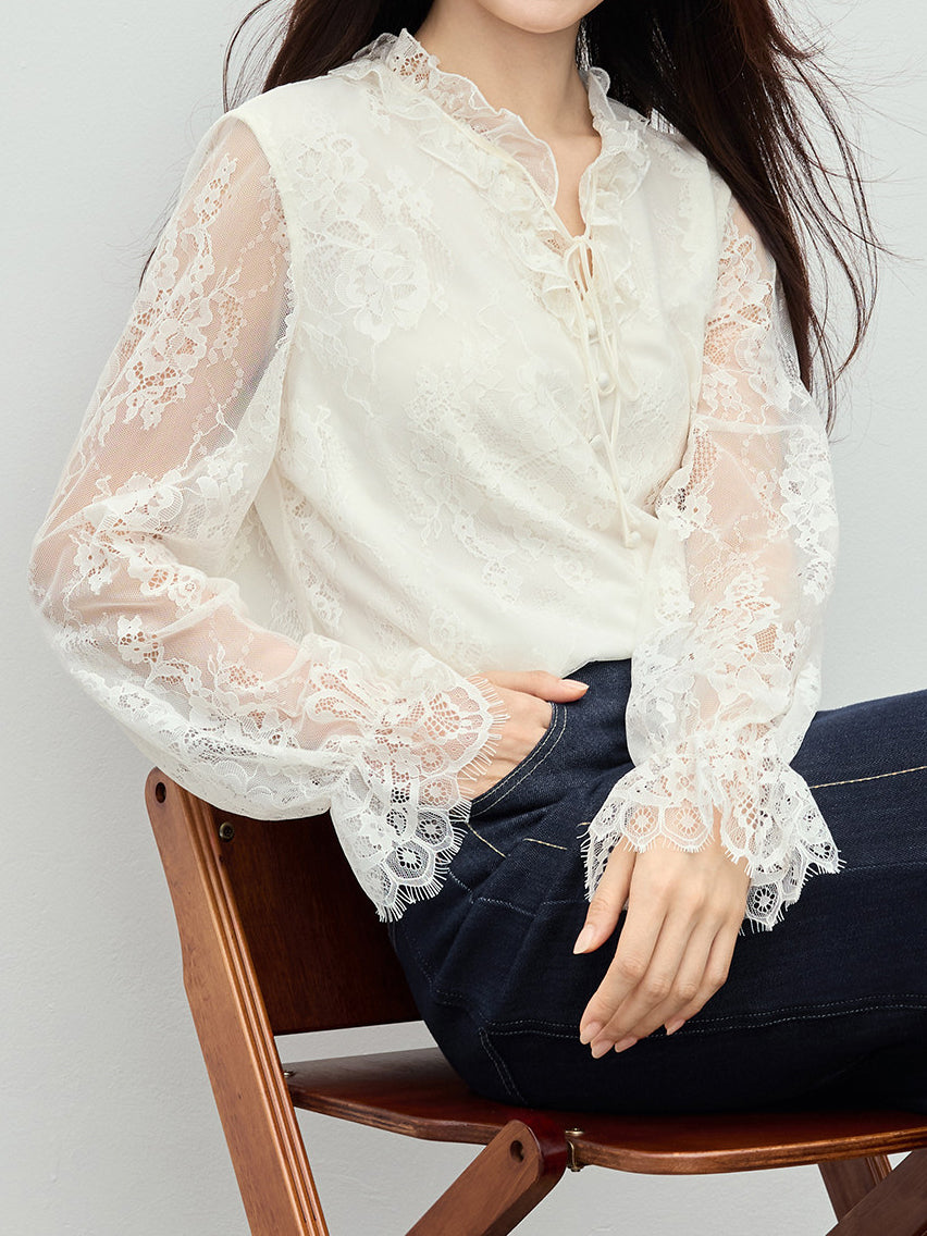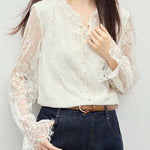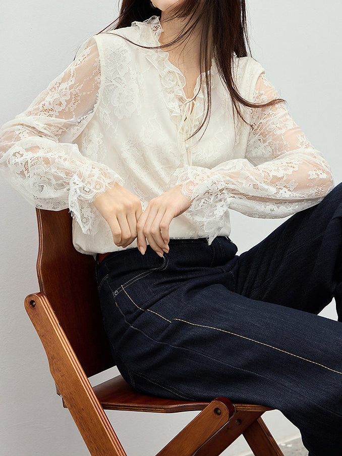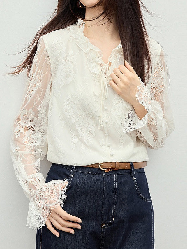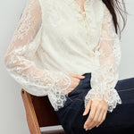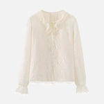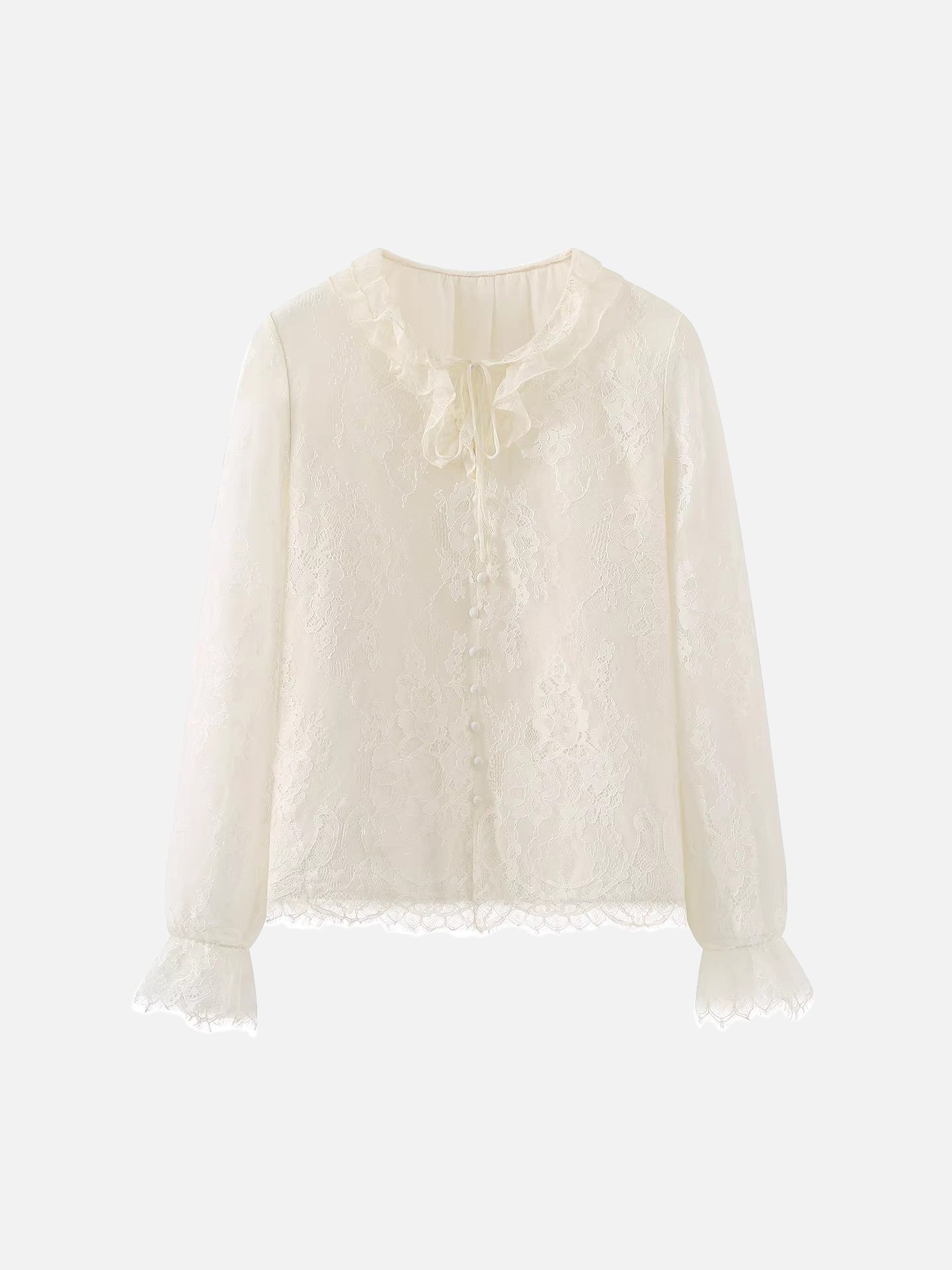 首元にさりげなくフリルをあしらい、女性らしさが引き立つブラウス。