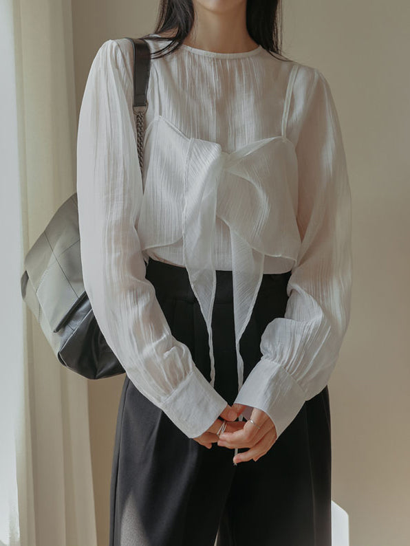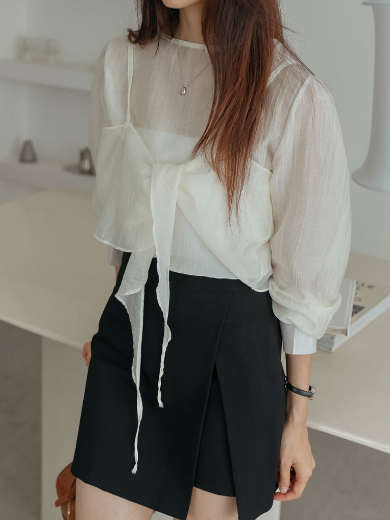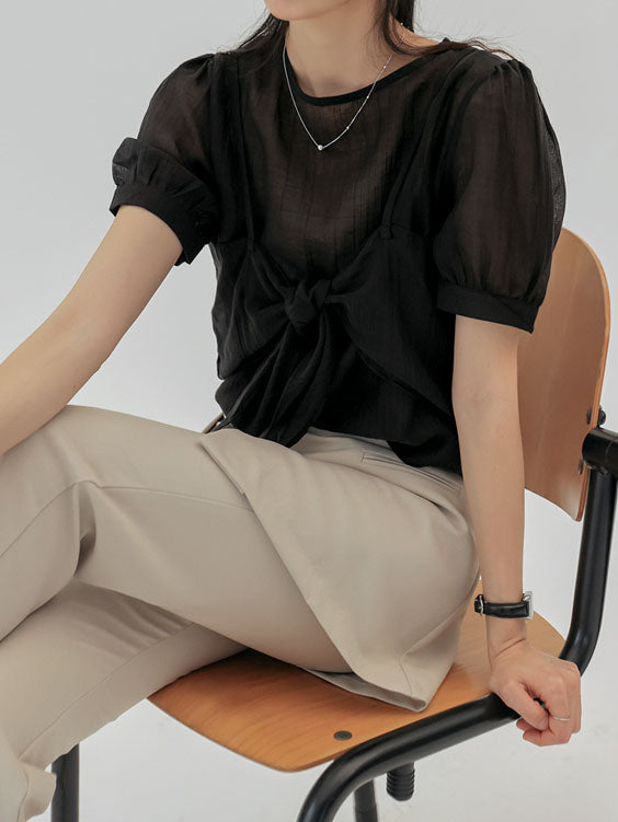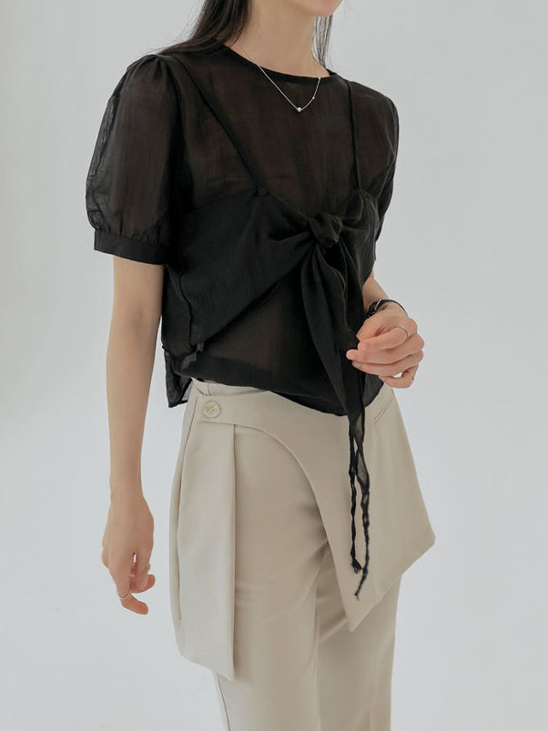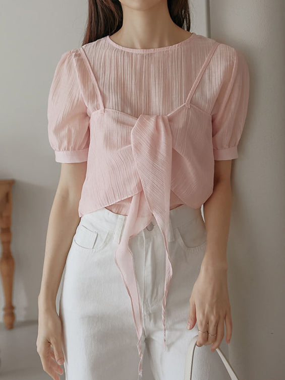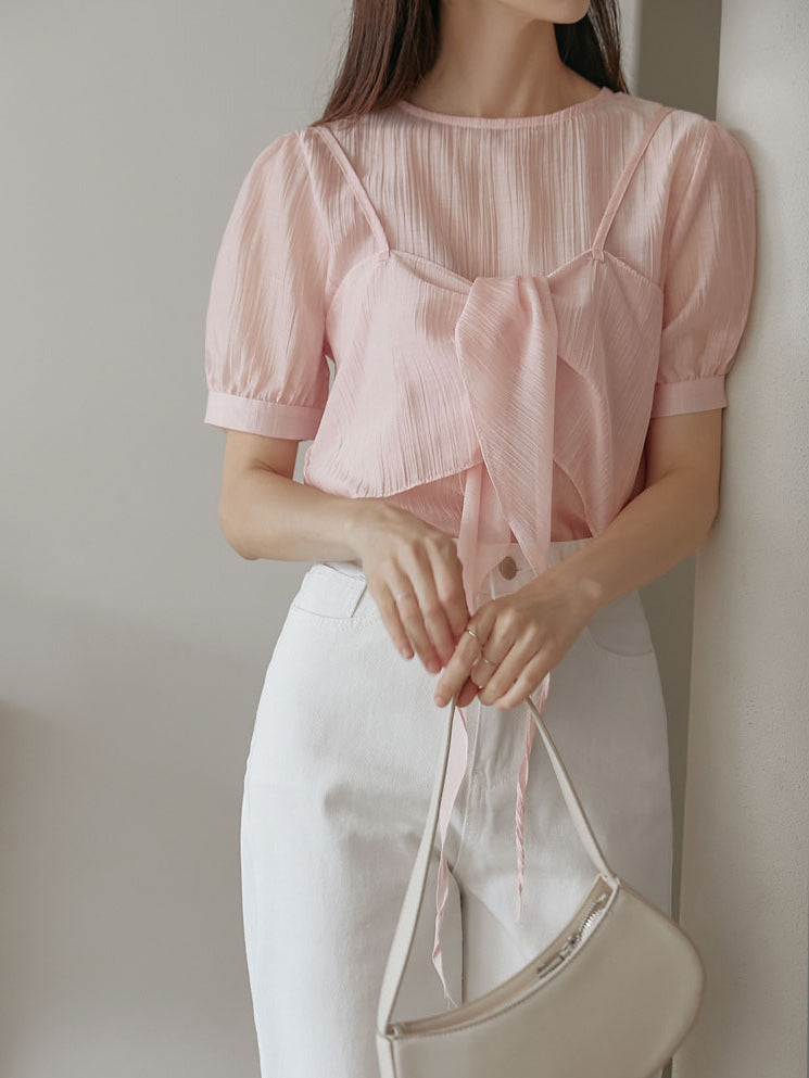 前後2WAYリボンビスチェ+楊柳ブラウスアンサンブル 5色入